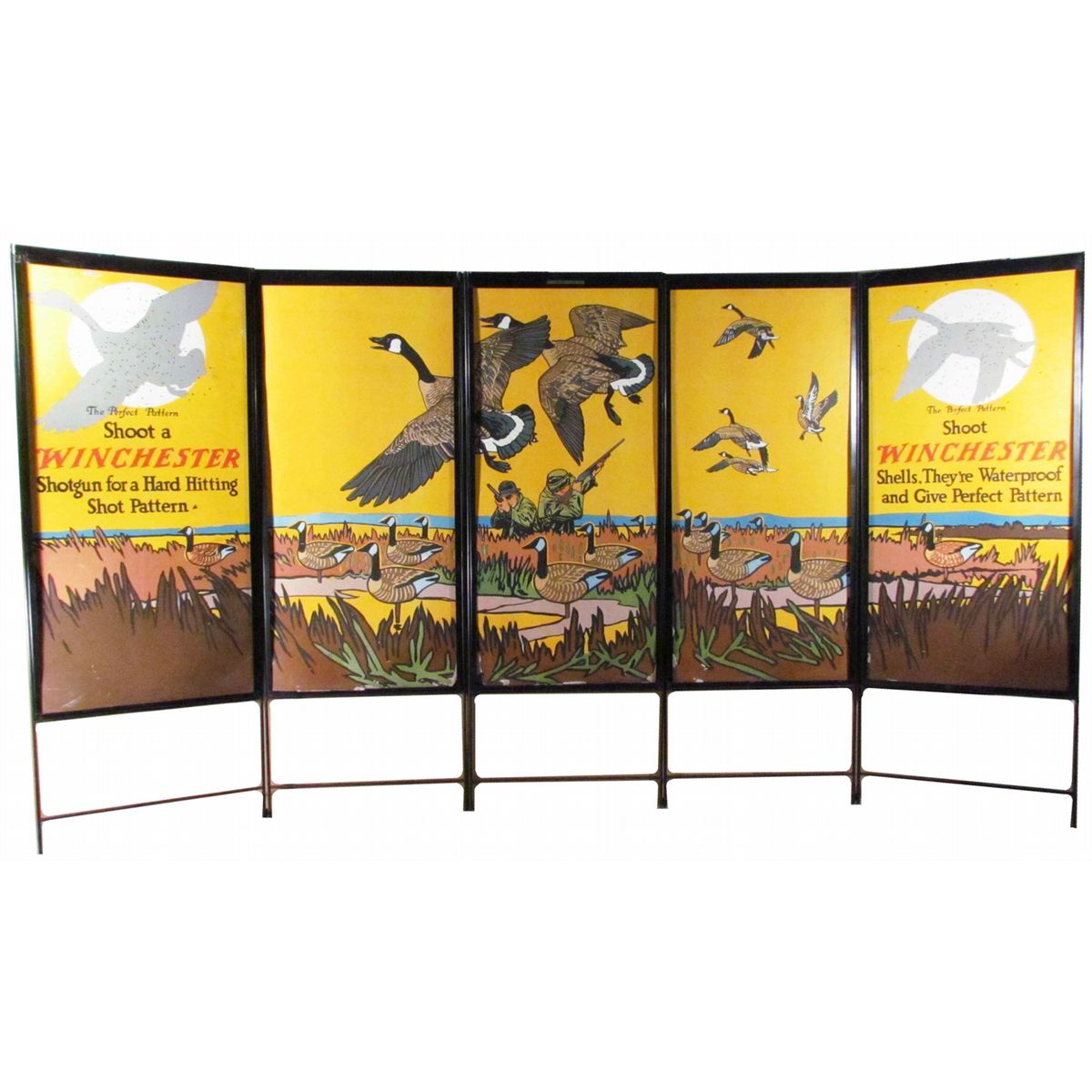 Winchester Window Display Cardboard panels. 5 two sided panels. One side Thanksgiving theme and the other side Amunition for shooting geese. Includes Metal Frame. Very good condition. Panels are 18 1/4 X 40 inches.