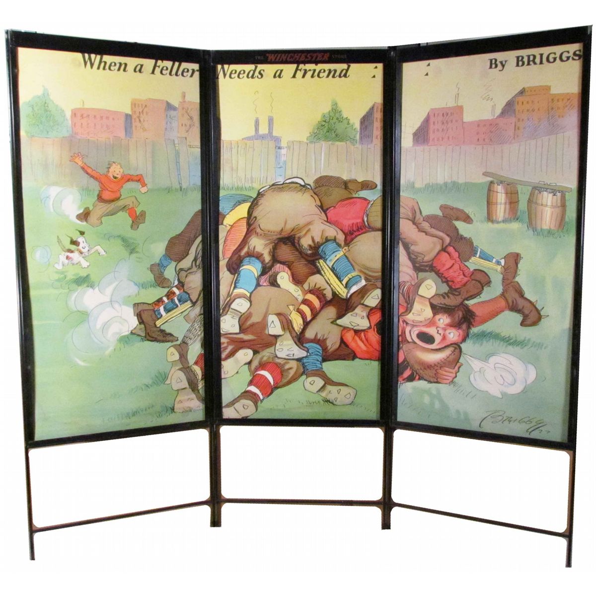 Winchester Window Display Cardboard panels. Three 2 sided panels. One with a Sports ( Football ) cartoon and the other advertising Flashlights. Comes with metal frame. Very good condition. Panels are 18 1/4 X 40 inches.