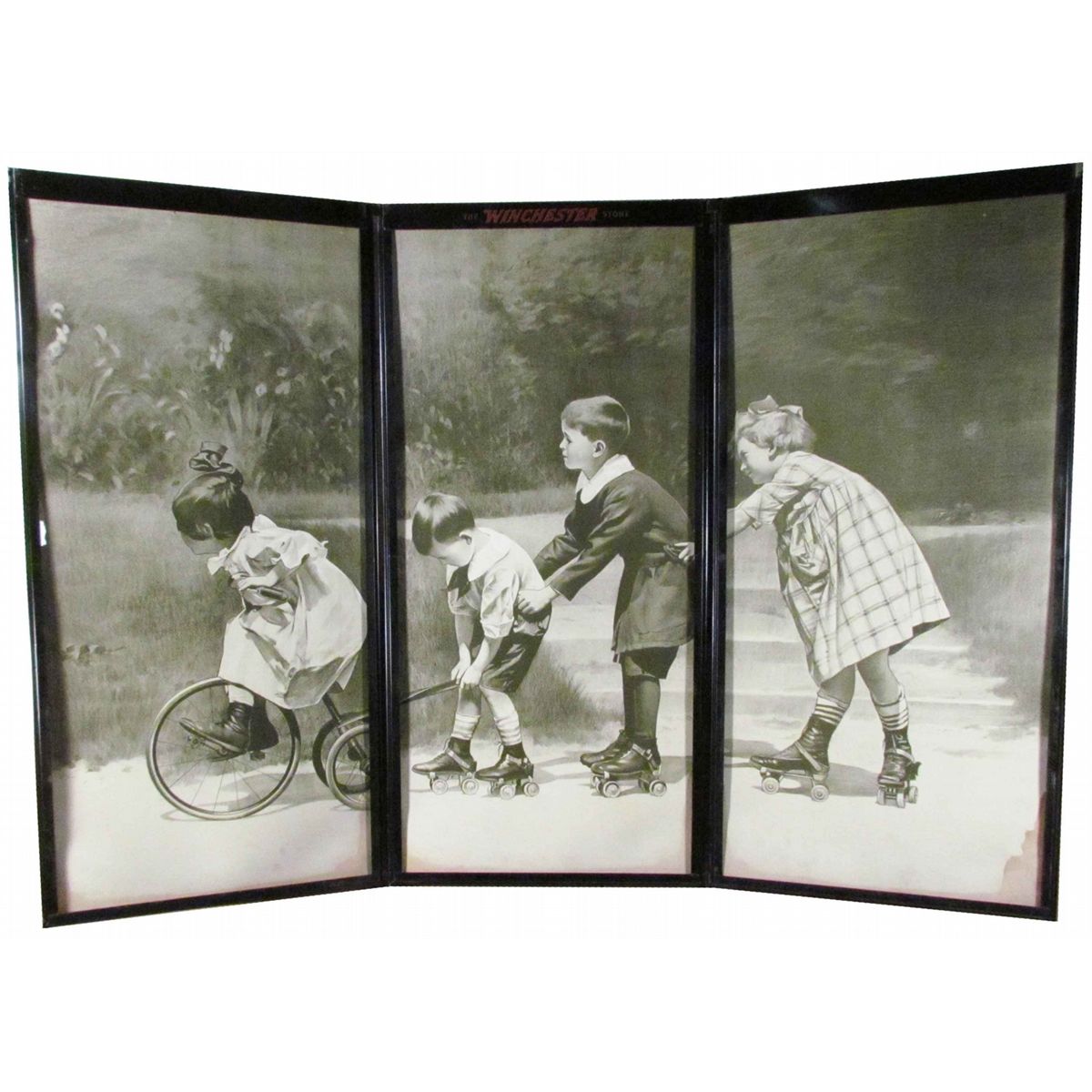 Winchester Window Display Cardboard panels.Three 2 sided panels. One side depicting kids roller skating and a woman moping a floor. Does not include metal frame. Very Good Condition. 18 1/4 X 40 inches.
