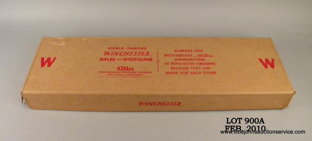 Winchester box, no end labels, purportedly for model 21, good condition, end flaps opening, red labels excellent, some staining. A desirable accessory for the Winchester collector. Measures approx. 31-3/4” by 9-1/2” by 2-5/8” deep. Est.: $150-$300