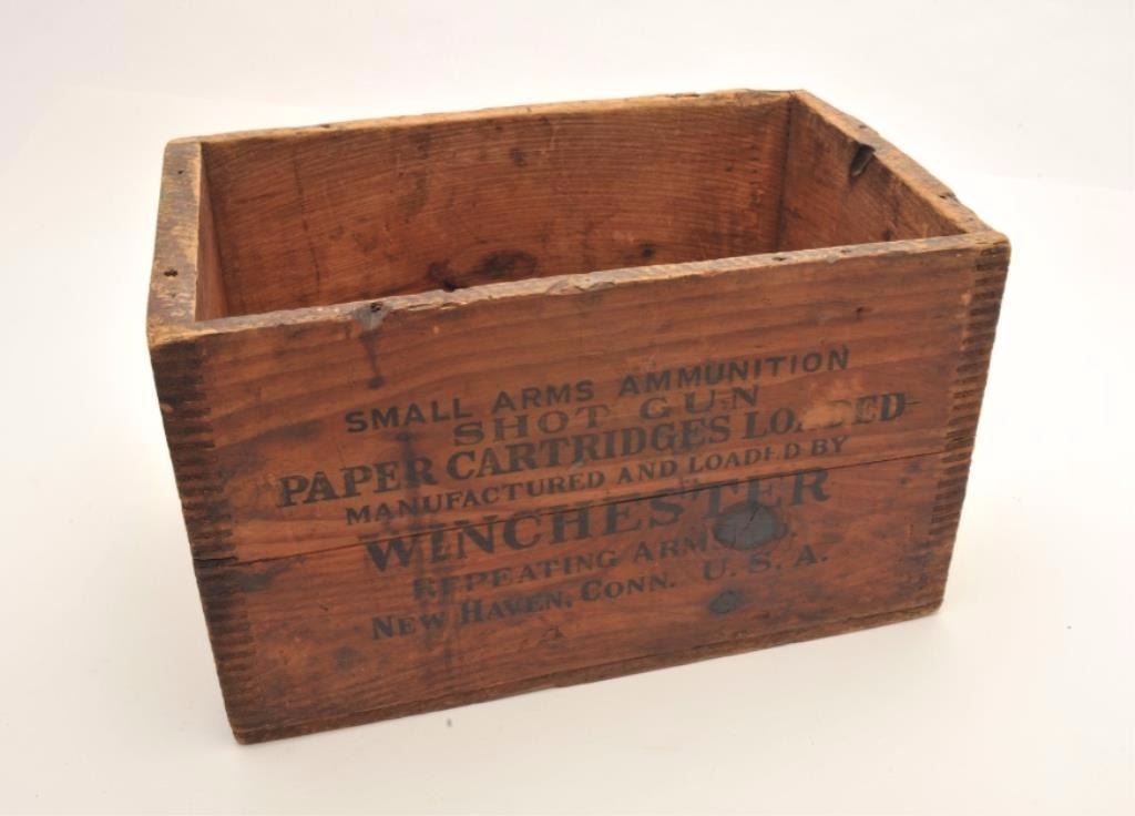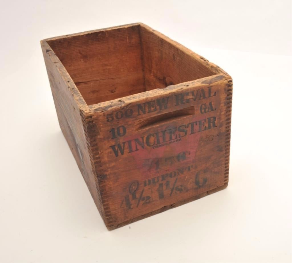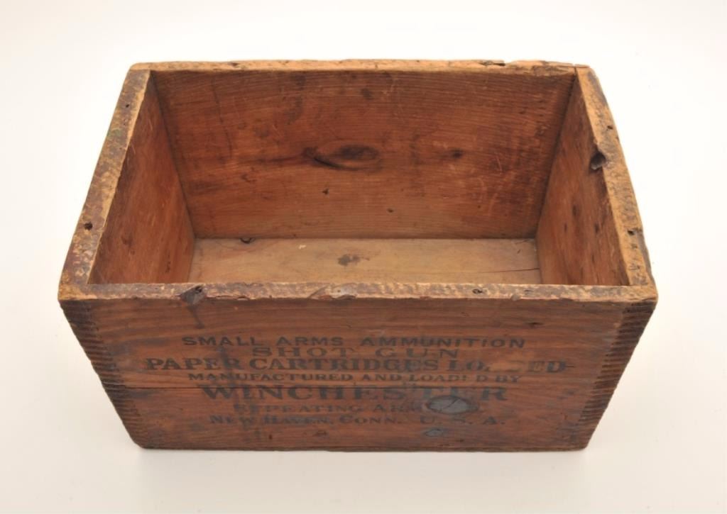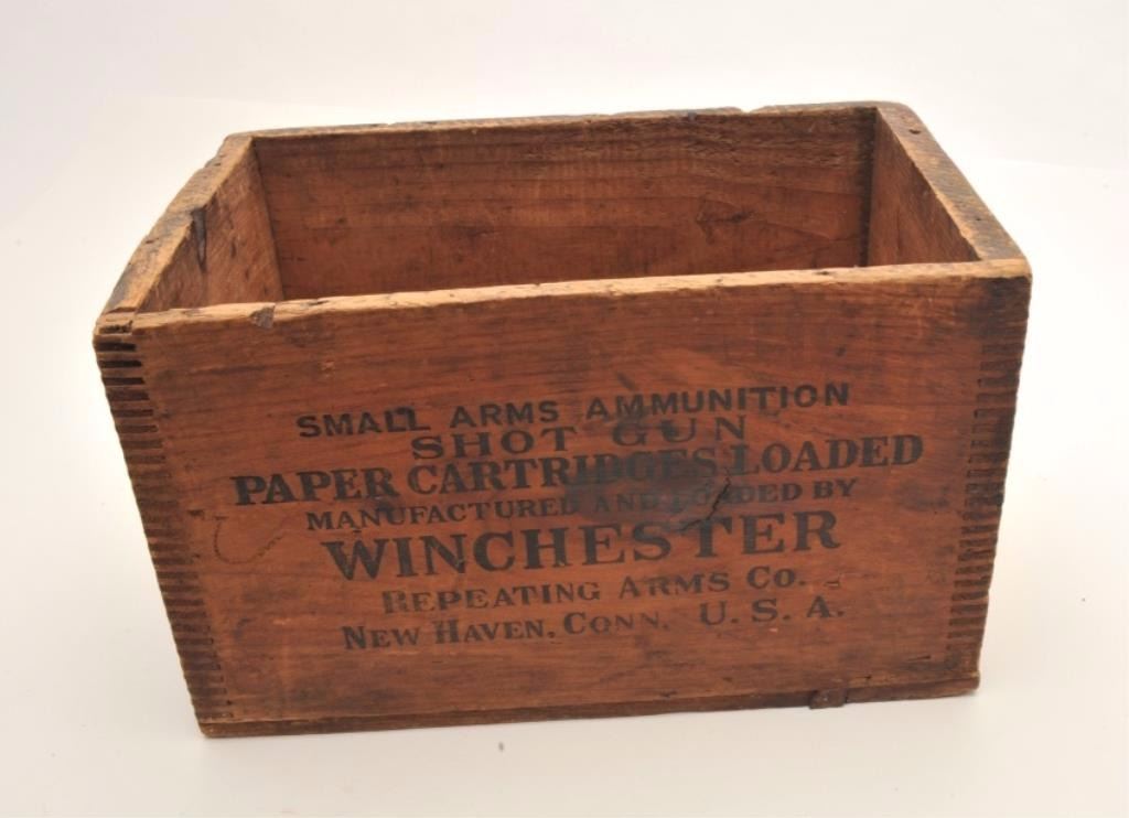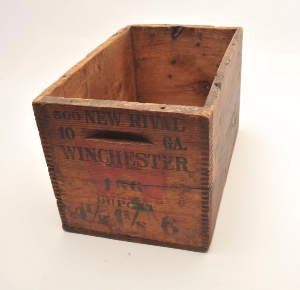Winchester factory wood small arms ammunition crate for 10 gauge shotgun cartridges, approximately 9.5” in height, 16” long and 10” wide; well-marked on all four sides. Est.: $50-$75.
