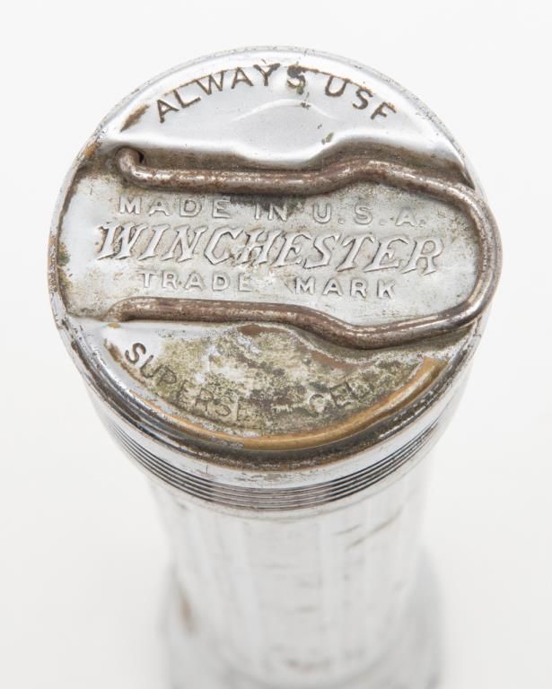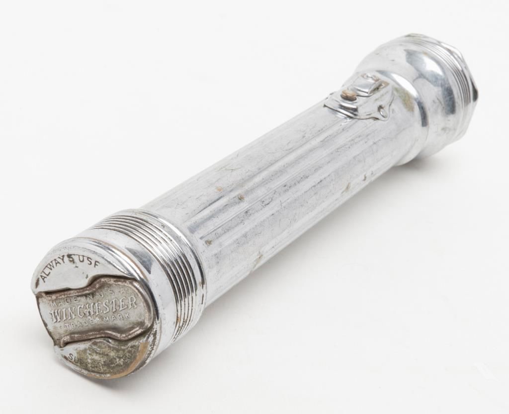 Winchester flashlight in overall good condition for its age; well marked; measures approx. 10” from lens to end. Est.: $50-$100.