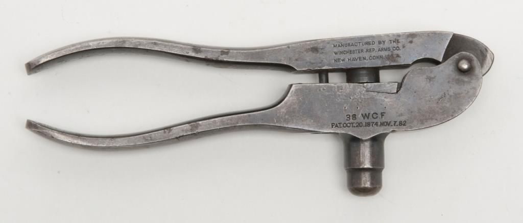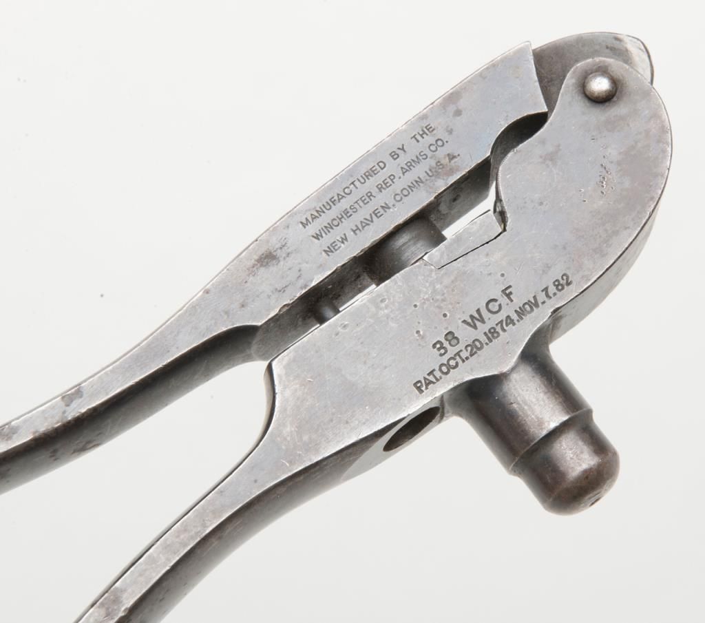 Winchester loading tool for .38-40 caliber in very good condition showing 50% to 70% original blue tool only. Sharp with just minor pitting. Est.: $100-$200