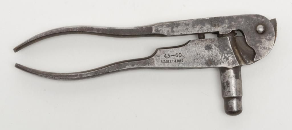 Winchester loading tool for .45-60, last patent date 1880. Fair to good condition with no de-capper. Made as accessory to 1876 lever action. Est.: $90-$180