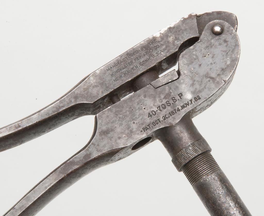 Winchester loading tool marked .40-70 S.S.P. probably for .40-70 Sharps straight and paper patched. The tool is fair to good with some minor pitting and erosion and no de-capper. Est.: $100-$300