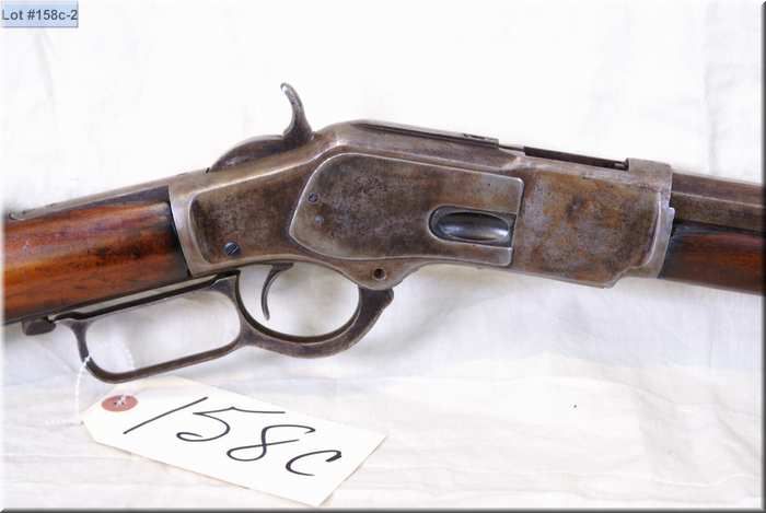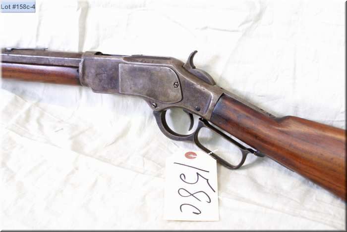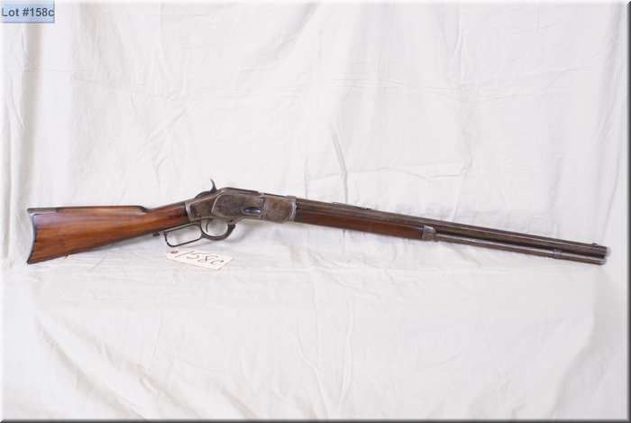 Winchester mod 1873 Third Model ..44 WCF cal lever action Rifle w/ 24" oct bbl full mag [ faded patchy blue turned brown, broken back sight, missing dust cover, sanded butt stock chipped by upper tang and cracked by toe, forewood missing large slivers both side, crescent butt plate, w/broken trap cover, Circa 1890 ] Ser # 347419B