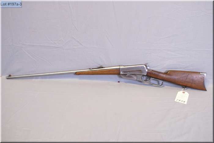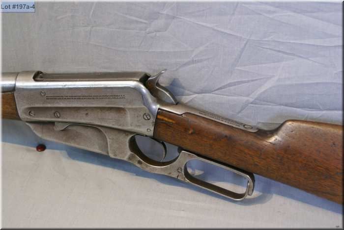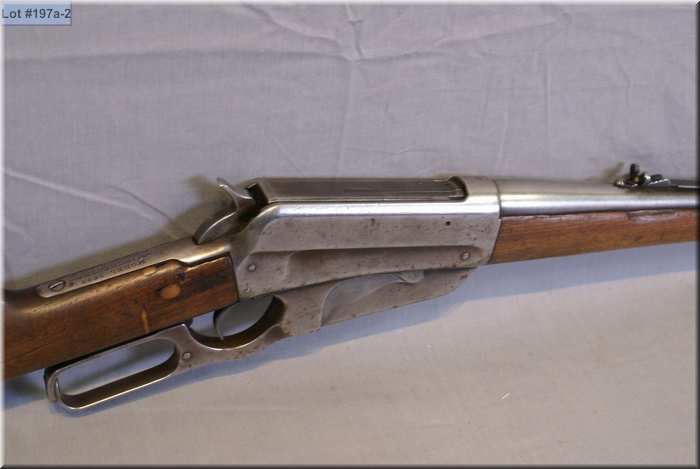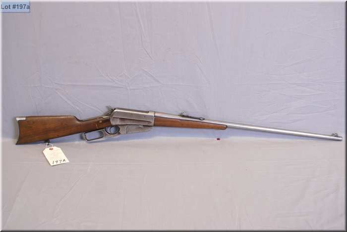 Winchester mod 1895 .30 Army ( .30-40 Krag) cal lever action Rifle w/28" bbl [ Circa 1915, traces of blue in protected areas, turned to a polished grey, cracked & weathered stock repaired at wrist behind rcvr, crescent butt, sling swivel installed in butt stock ] Ser # 77496B