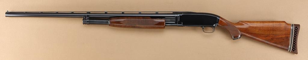 Winchester model 12, 12ga, factory 30” barrel, with factory ventilated rib, select checkered wood stock, full choked, hard-rubber recoil pad added with two spacers, serial #1756973. The gun remains inoriginal very good condition showing 90-95% original blue, just thinning slightly at edges and operating areas. The stocks are very good and show a light coating of revarnish, probably when pad was added. Thebuttstock measures 13-1/4” to the end of the wood, 15” to the end of the extended recoil pad which is neatly done. The action is good, the bore is excellent. A good quality model 12 with high-rise cheek piece set up forTrap. Est: $600 - $1,200