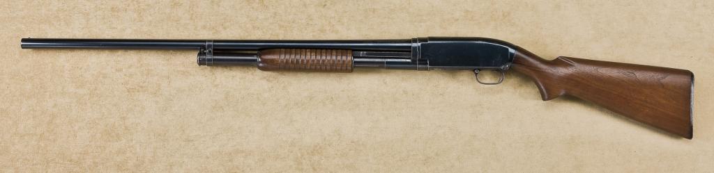 Winchester model 12, 12ga pump-action shotgun, 30” barrel, full choke, serial number “1477567”. The gun remains in original good to very good condition showing 80-90% original blue, some drifting to the edges, some light erosion and storage rust. The stocks have been lighting cleaned with steel wool, the action good, markings good, excellent bore, would improve with cleaning and added finish to stock. Est.: $400-$800