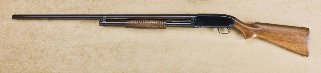 Winchester model 12, 12ga, pump action shotgun, factory 32” full choked barrel, with raised mill rib, nicely restored blued finish, standard wood stocks, Winchester butt plate, serial number “674431”. The gun shows 95% of an old reblued finish that is beginning to plum and turn. The stocks are replaced and are in very good condition with some sight scratches. The buttplate is later. Action good, bore very good. 32” barrels with raised ribs are scares in the model 12 series. Est.: $350-$700