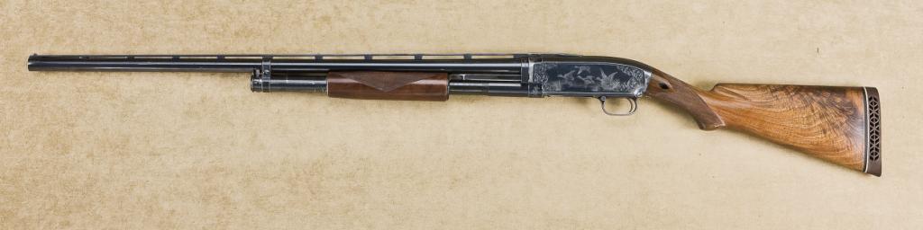 Winchester model 12, 12ga, pump action shotgun, factory style engraved, 30” barrels, factory ventilated rib, checkered select wood stocks, serial number “515122”. The gun remains in original very good condition with approx. 70-80% original blue, thinning at operating areas and edges. The gun has been expertly restocked in burl walnut and a hard rubber recoil pad added. The wrist in inlayed with a black diamond inlay. The stock measures approx. 14-1/2” to the end of the wood, approx. 15-1/2” to the end of the pad. The engraving is absolutely genuine to the period and shows ducks on the left, and hunting dogs flushing game on the right. Est.: $3,500-$7,000