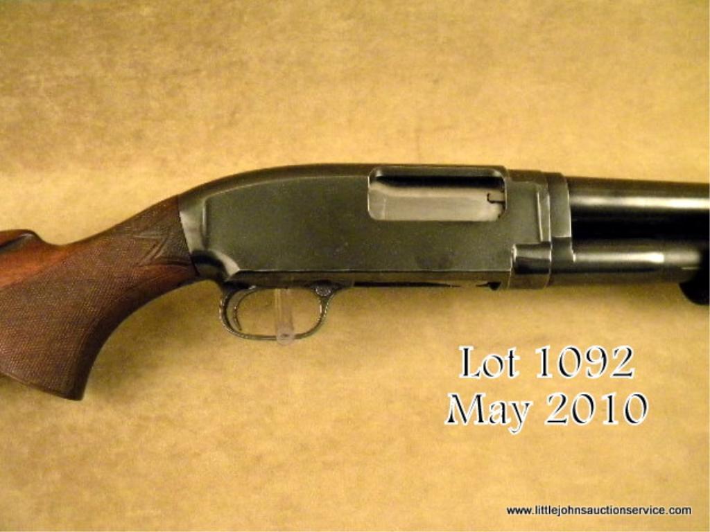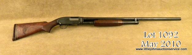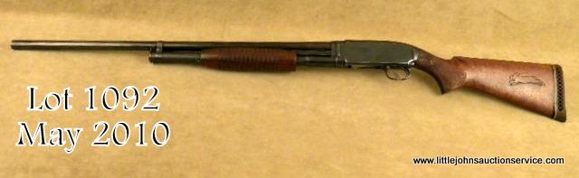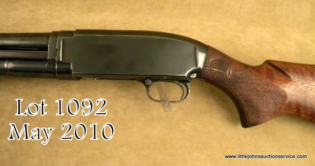 Winchester model 12 12ga pump-action shotgun marked for super speed and super-X (3" chamber). 30" barrel, full choked, in very good plus to near fine condition with custom checkered and carved buttstock. Serial 1587451. The metal surfacesretain 90-95% original blue thinning on the edges of the frame and operating areas. Markings sharp, metal crisp, original forend is very good. The replacement buttstock is nicely made with semi-pistol grip, wide checkering with fancyinitial "D" at top. A leaping rabbit on left center of buttstock, a flying mallard on right side of buttstock. A pachmeyer recoil pad has been added. The action is good, the bore is excellent. The gun is mechanically sound. Est: $500 -$1,000