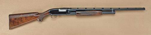 Winchester model 12, 20ga, pump-action shotgun, 26” barrel, factory ventilated rib, select checkered walnut stock, hard-rubber recoil pad, steel pistol grip cap, serial #1923367. The gun shows 90-95% original blue, some lightening just at the edges, some minor scratches, but generally excellent overall with near fine wood showing a beautiful grain, just some light scratches, Winchester hard-rubber recoil pad retained. Tight action, excellent bore. Est: $900 - $1,800