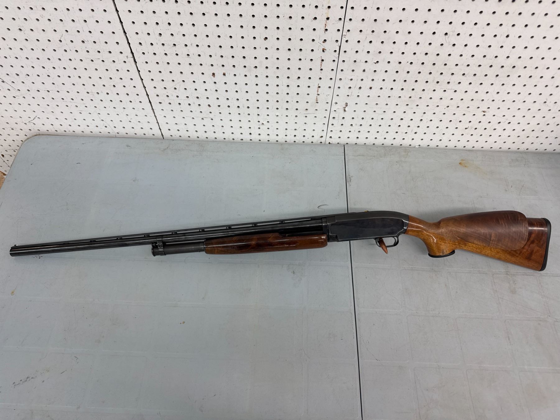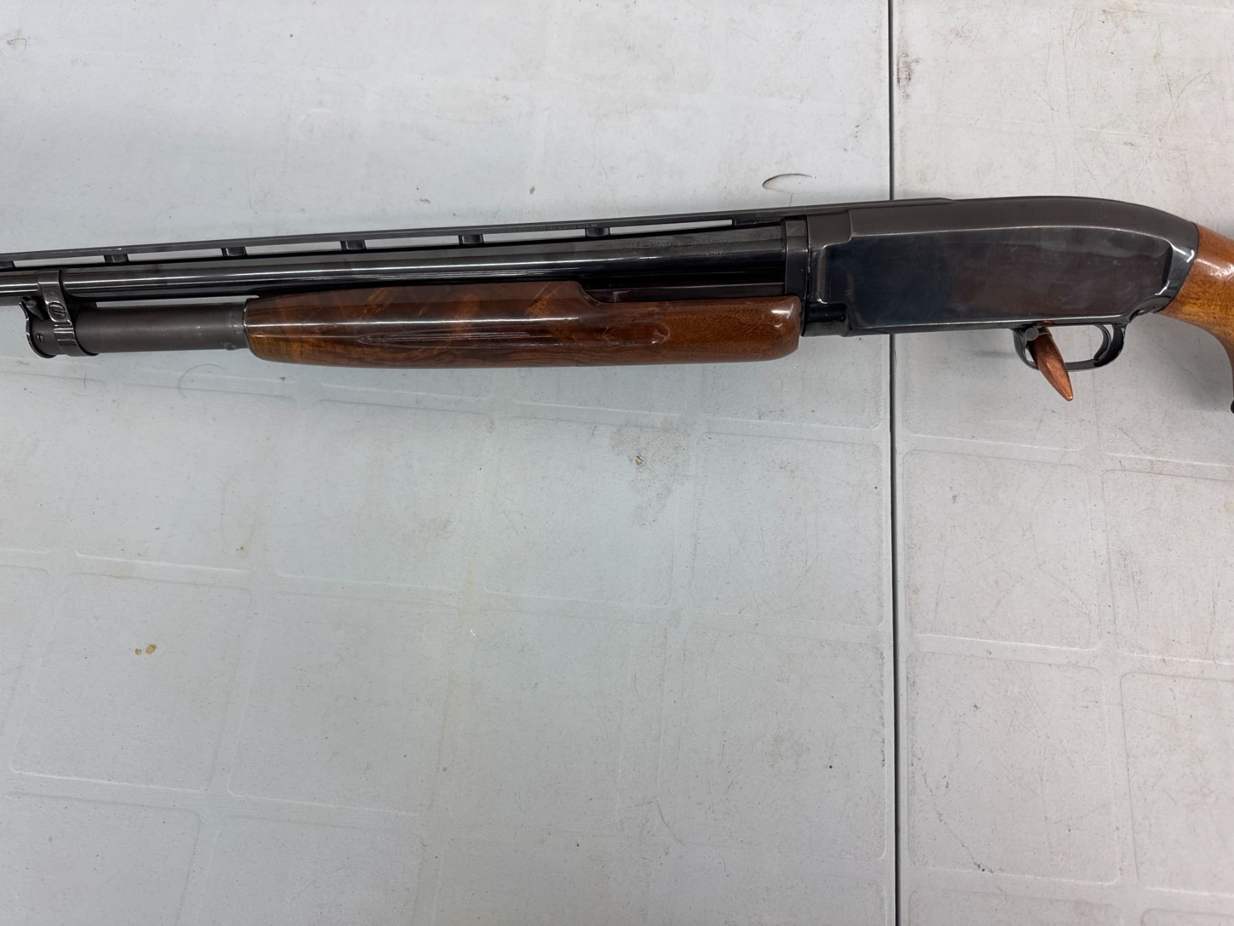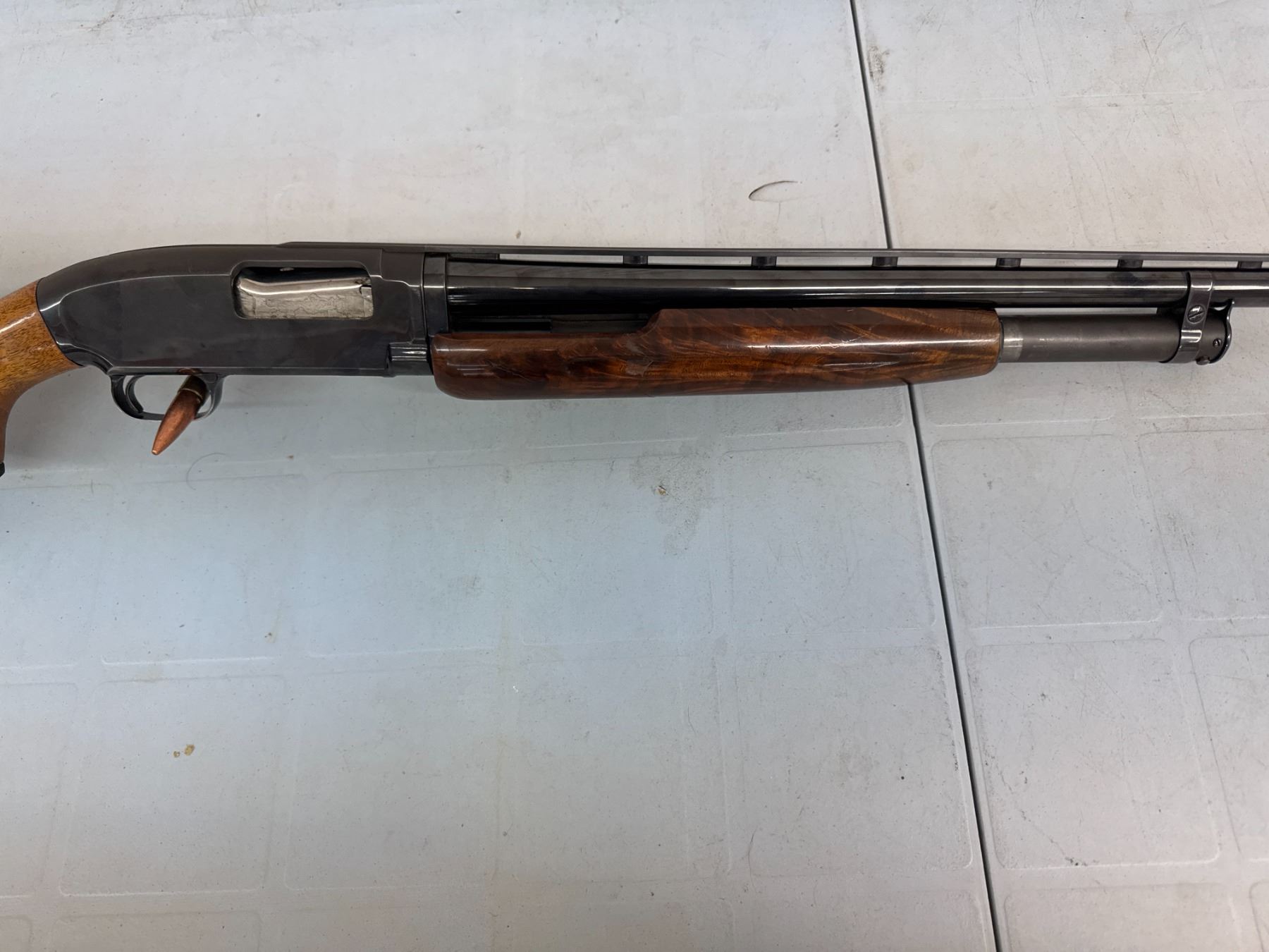 Pump action. retains approx 90% of its blue finish. Action functions smoothly, Bore on teh ribbed barrel is shiny. Stocks are in good condition. Rear stock has been replaced and a poorly fitted recoil pad has been installed.