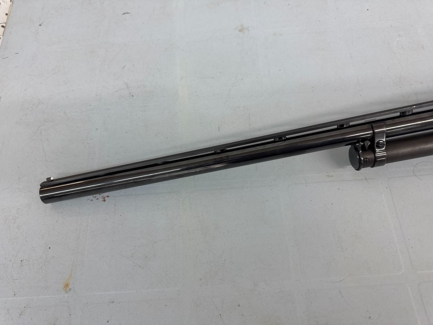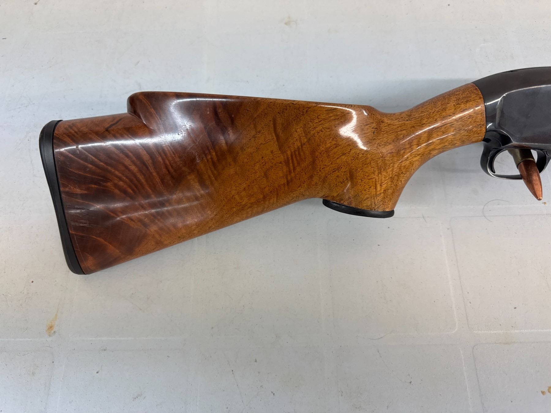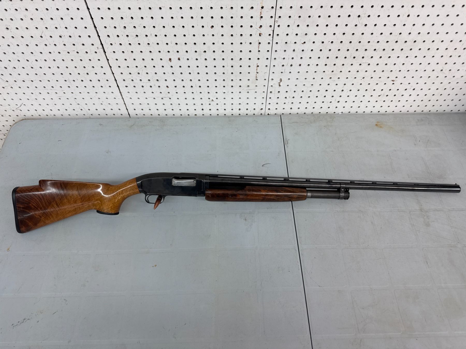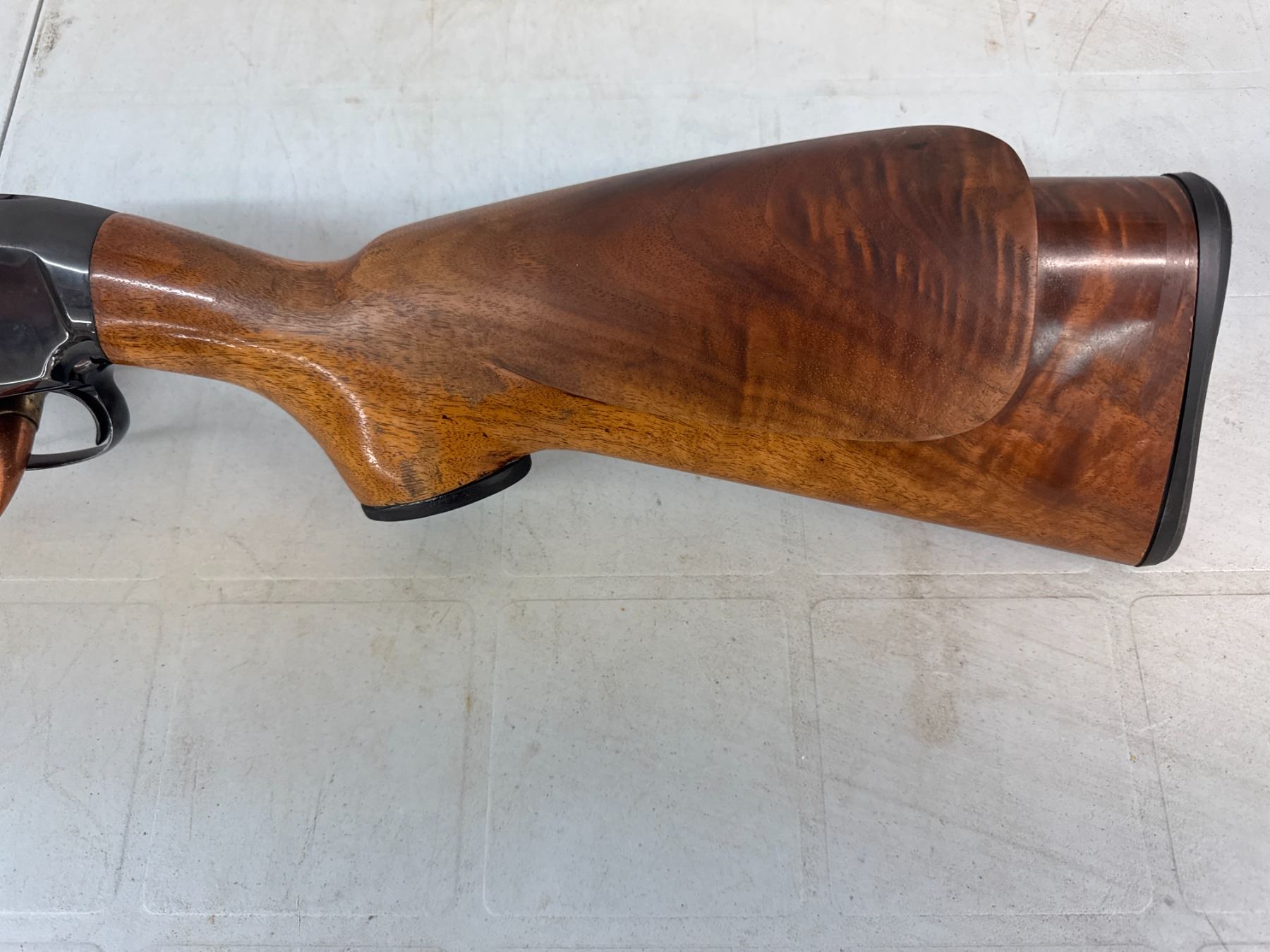 Pump action. retains approx 90% of its blue finish. Action functions smoothly, Bore on teh ribbed barrel is shiny. Stocks are in good condition. Rear stock has been replaced and a poorly fitted recoil pad has been installed.