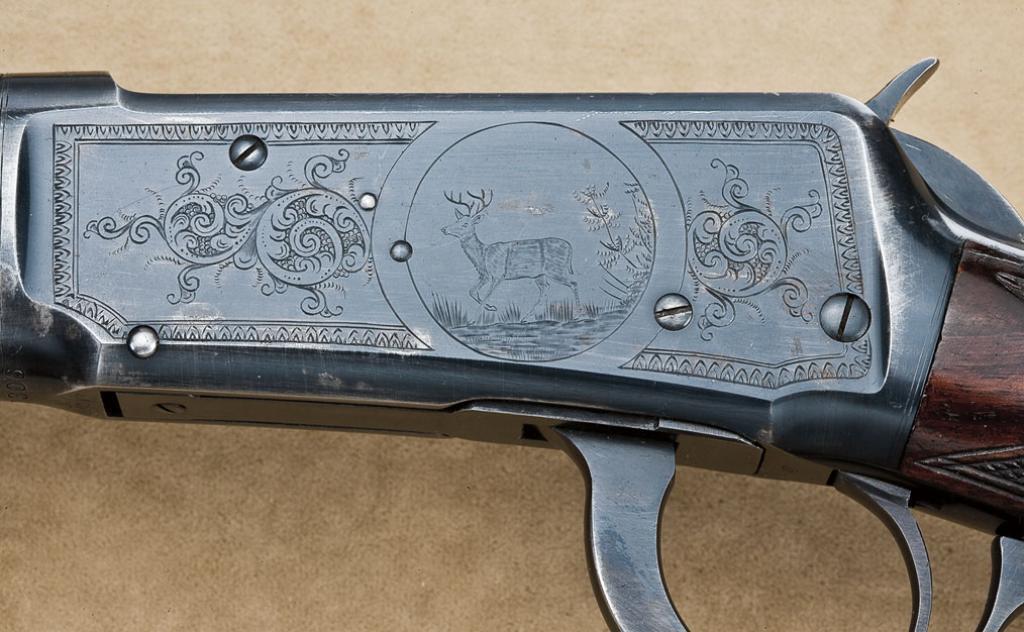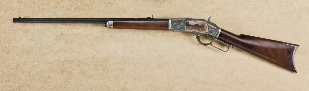 Winchester model 1873, .32-20 caliber, semi deluxe rifle, 24” octagon barrel, button mag, blue and case hardened finish, select wood stocks. Serial number 101961A. The rifle remains in near fine original condition showing 90-95% original blue on barrel, some drifting at the edges, minor toning, and some small areas of erosion just starting and natural aging. The barrel address and caliber markings are ultra sharp. The frame shows 75-85% case hardened colors, beginning to mute and tone and drift at the edges with some erosion and darkening developing, mostly on the right side plate and a few small areas. The case hardening is still showing strong with some very fiery areas. The dust cover shows 95% original blue, the forend cap shows traces of case hardening drifting to silvery grey, as does the butt plate. The select plain varnish stocks are very good plus with a few minor marks, some storage, and very light even aging. A few bumps and mars from storage. The loading gate shows 90-95% bright original blue, the hammer and lever show 70-80% case hardening with some vivid areas. The action is good, the bore is near excellent. A crisp 73 with colors that Winchester collectors like to see. Est.: $9,000-$18,000.