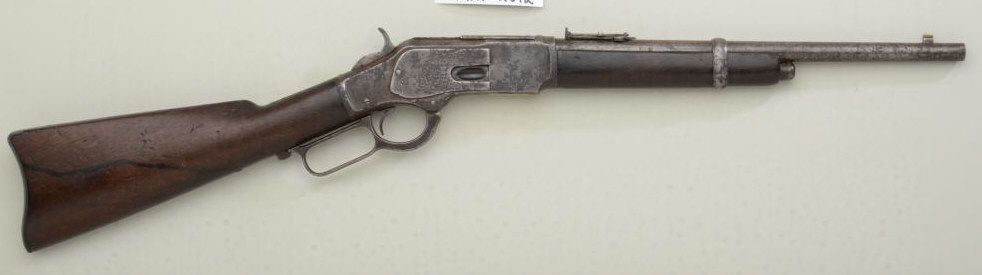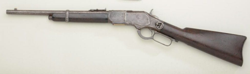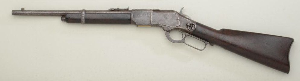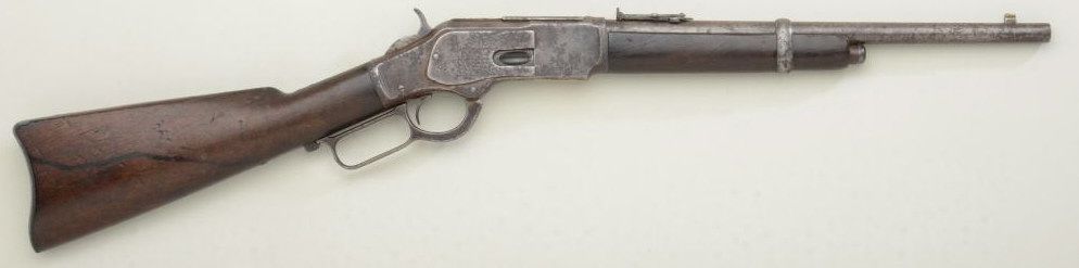 Winchester model 1873 Special Order Trapper's model carbine, serial #127884A. Shows 15" original length barrel, button mag, .44-40 caliber. Type ordered by Rurales (Police) in Mexico. 1876 rear sight in original dovetail. Front sight blade is an old replacement in original base. Good to very good overall. Est: $3,500 - $7,000
