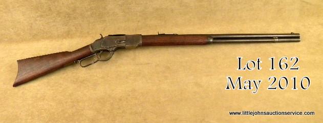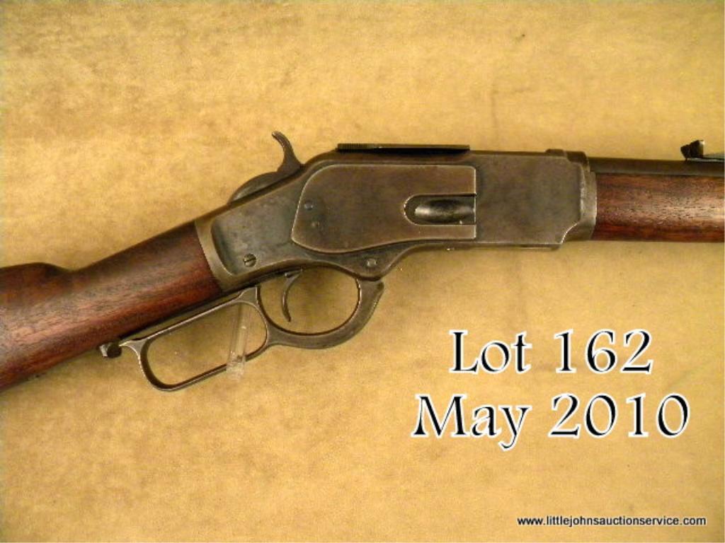 Winchester model 1873 lever action rifle, 24" round barrel, .38-40 caliber full magazine, crescent butt, in very good original condition, #392451B. The barrel and tube show 30-50% original blue that is evenly toning and drifting to brownwith some scattered beginning erosion, light rust, and just starting pinprick pitting. The receiver shows 20-40% blue, going to a brownish patina, with some scratches, normal aging. The hammer and lever show traces of case hardening within apatina. The stocks are good to very good with an excellent wood to metal fit and a light cleaning with a steel wool or acetone. The front sight is a Marble #8 in the original dovetail. The rear sight is standard. The markings are good, theaction good, the bore good to very good and may clean to even better. Est: $1,500 - $3,000