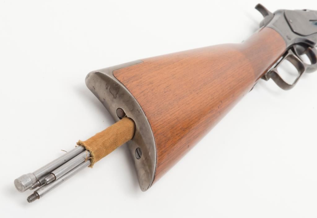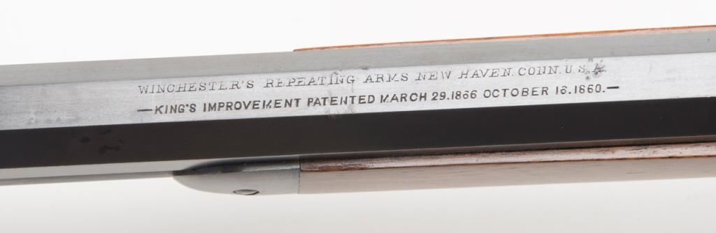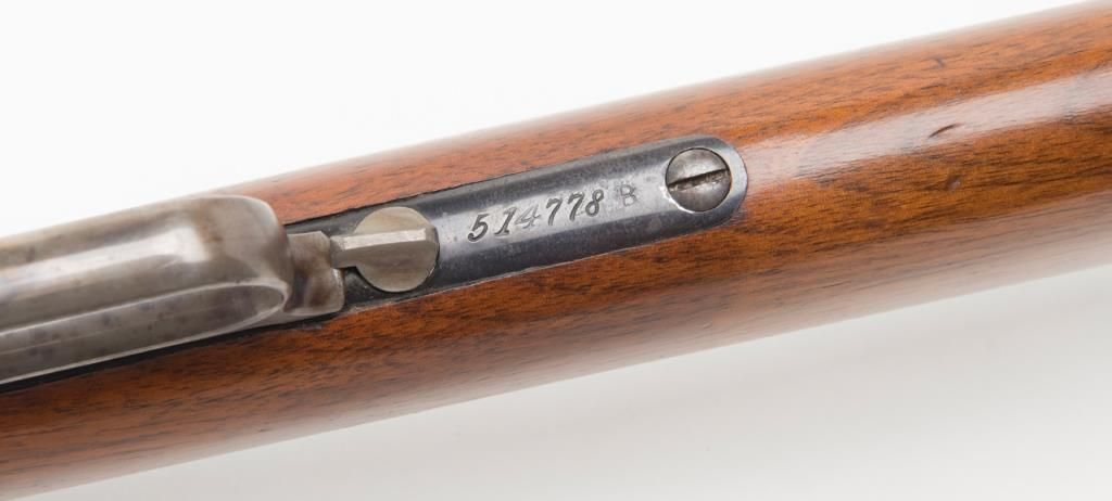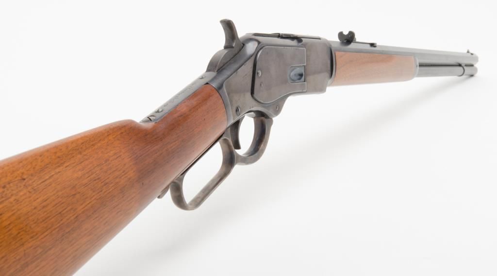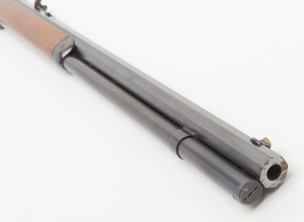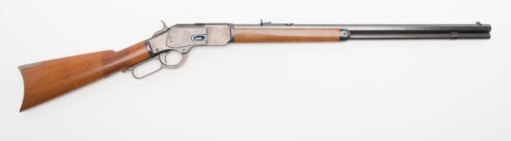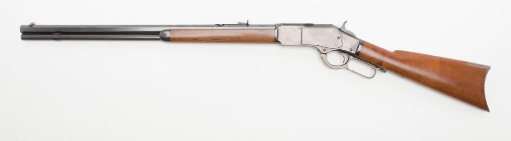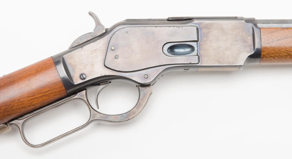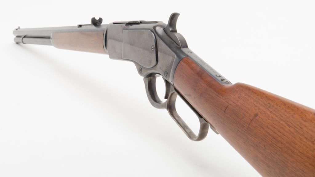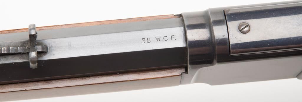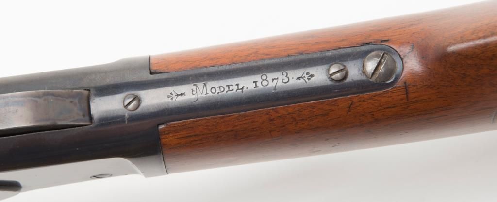 Winchester model 1873 lever action rifle in .38-40 caliber with 24” octagon barrel, full magazine, rifle butt in excellent original condition, serial 514778. This immaculate ’73 retains 95%-98% original blue thinning slightly at the high points and edges and almost no wear or use. Very bright with a couple of light scratches. The wood is excellent and the hammer and lever show most case hardening. A strong 9.5 on a 1-10 scale and almost impossible to improve upon this pre-98 model 1873 rifle. Est.: $3000-$6000