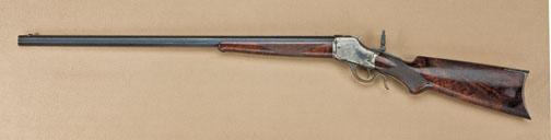 Winchester model 1885 highwall rifle, .32-40 caliber, factory deluxe checkered burl walnut stock, pistol gripped, rifle butt, 28” octagon #3 barrel, blue and case hardened finish, serial #20668. The rifle remains in good to very good condition and show 75-85% toning blue finish on barrel, some lightening at the edges, slight erosion, pinprick pitting just starting. The rearsight dovetail has been filled by a blank and there is a tap hole and screw in the barrel in the area where the rear sight would have rested and is not factory. There is a period non-factory brass and iron sight in the front dovetail and the rifle shows a marble tang sight of a slightly later era. The frame shows 40-60% case hardening drifting to silvery grey with some areas of rainbow colors showing. There is some areas of spotting, erosion, and pinprick pitting. The stocks have been lightly refinished but fit up to the metal well and show a two to three-x grain and good checkering. The action is tight, the bore is near excellent. A nice deluxe highwall that could be improved. From the Howard Bud" Goebel collection. Est: $1
