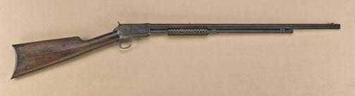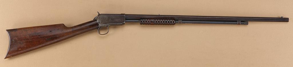Winchester model 1890 pump-action rifle, .22 short caliber, blue and case hardened finish, takedown frame, serial #42214. The barrel shows 30-50% original blue turning plum with a like amount on the tube. The frame showstraces of case hardening within a grey brown patina finish. The stocks are good to very good with some even wear, minor marks, normal carry and use. The markings sharp, the edges fairly crisp. The action good, the bore very good and still bright. Original sights are retained. The bolt shows two areas of small repairs. An early and restorable Pre-1898 model 90. Est: $400 - $800