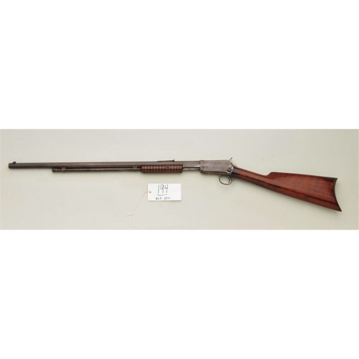 Winchester model 1890 pump-action rifle with octagon barrel, .22 short caliber, serial #177100. Good to very good overall condition showing brown patina finish with traces of original blue, good wood, good markings, good overall with two gallery fast-loaders. With notarized statement from recognized old time collector stating that this rifle was purchased in 1952 or 1953 at the shooting gallery of Coney Island, Brooklyn, New York,where it was used extensively. The action is good, the bore is fair to good with considerable use. Est: $400 - $800