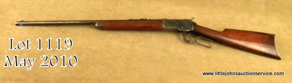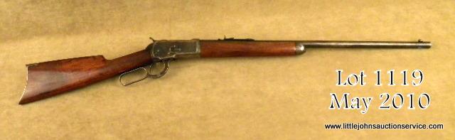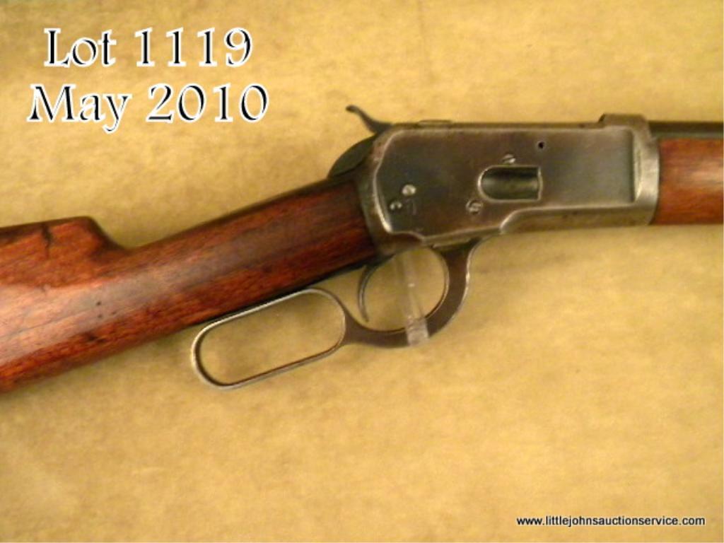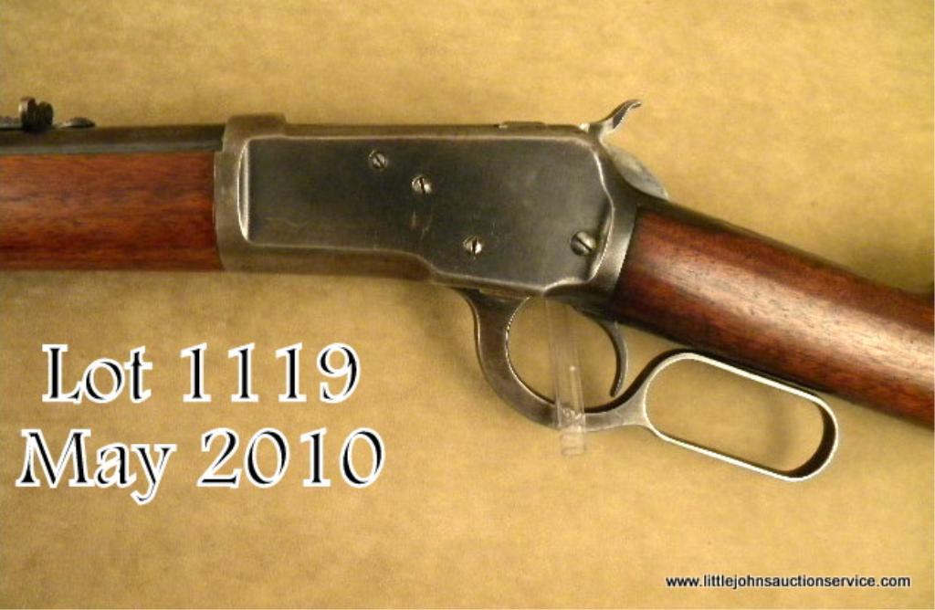Winchester model 1892 lever-action rifle .25-20 caliber, 24" round barrel, button mag, crescent butt, #919602. The rifle remains in good to very good original condition showing 50-70% original blue overall. Some even drifting and toning,lightening at the edges of the frame, just starting beginning erosion, and some light scratches. The stocks are very good plus showing some minor dings mars, minor scratches. Excellent wood to metal fit. Good markings, tight action,good bore that looks like it will improve with cleaning. Est: $1,400 - $2,800
