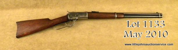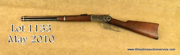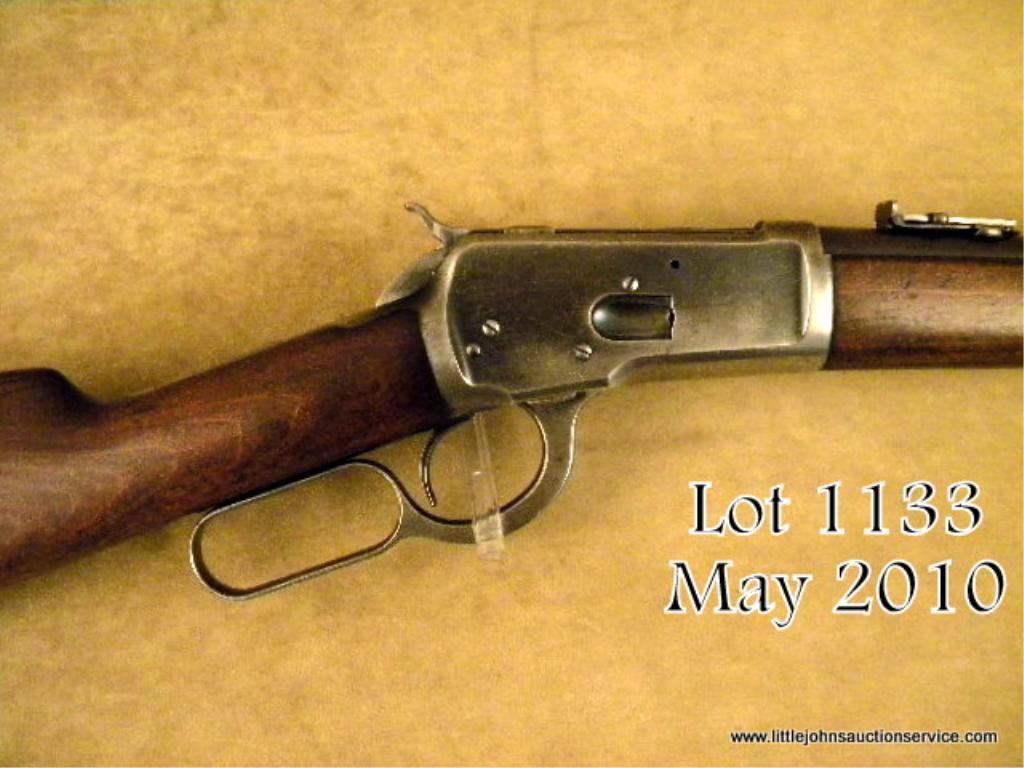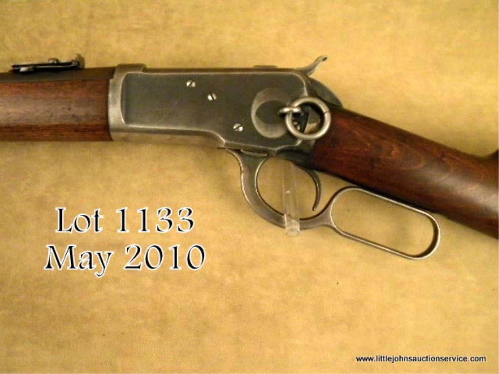 Winchester model 1892 saddle ring carbine in highly desirable .44-40 caliber, all features standard as that of carbine, #330052. The carbine shows 40-60% evenly thinning and toning blue finish lightening at the edges of the frame, someslight scratches, and just normal aging. The hammer and lever show 20-40% case hardening. The stocks are good with some dings, mars. Some gouges around the forend band when an owner was engraving the band area he made a star pattern,probably for his identification. The action is tight, the bore is good to very good. Est: $2,500 - $5,000