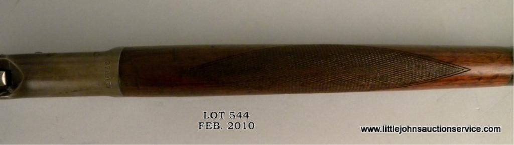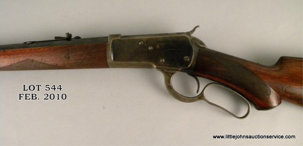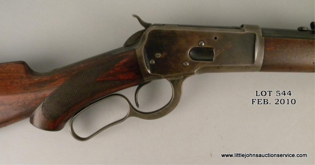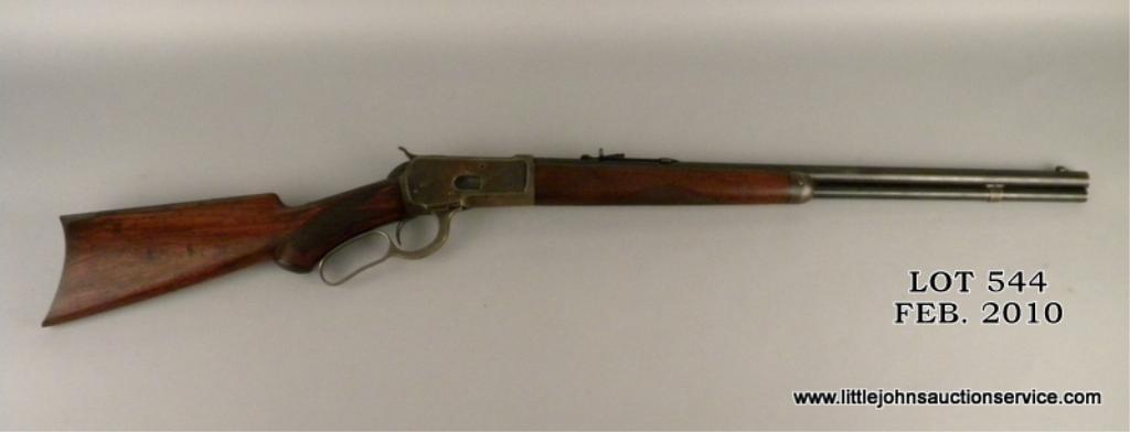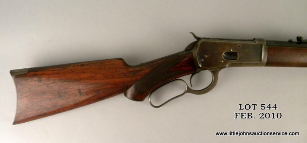 Winchester model 1892 special order rifle with factory 22" full round barrel, full mag, checkered pistol gripped stock, serial #378937. This scarce shorter than standard rifle is in .25-20 caliber and retains 75-85% original blue overall with most of the loss of finish on the frame. The stocks are very good with fairly sharp checkering and a few minor marks in the wood. The markings are sharp, action tight. A nice rifle and the only pistol gripped checkered short rifle we have seen in a long while. Est: $1,500 - $3,000
