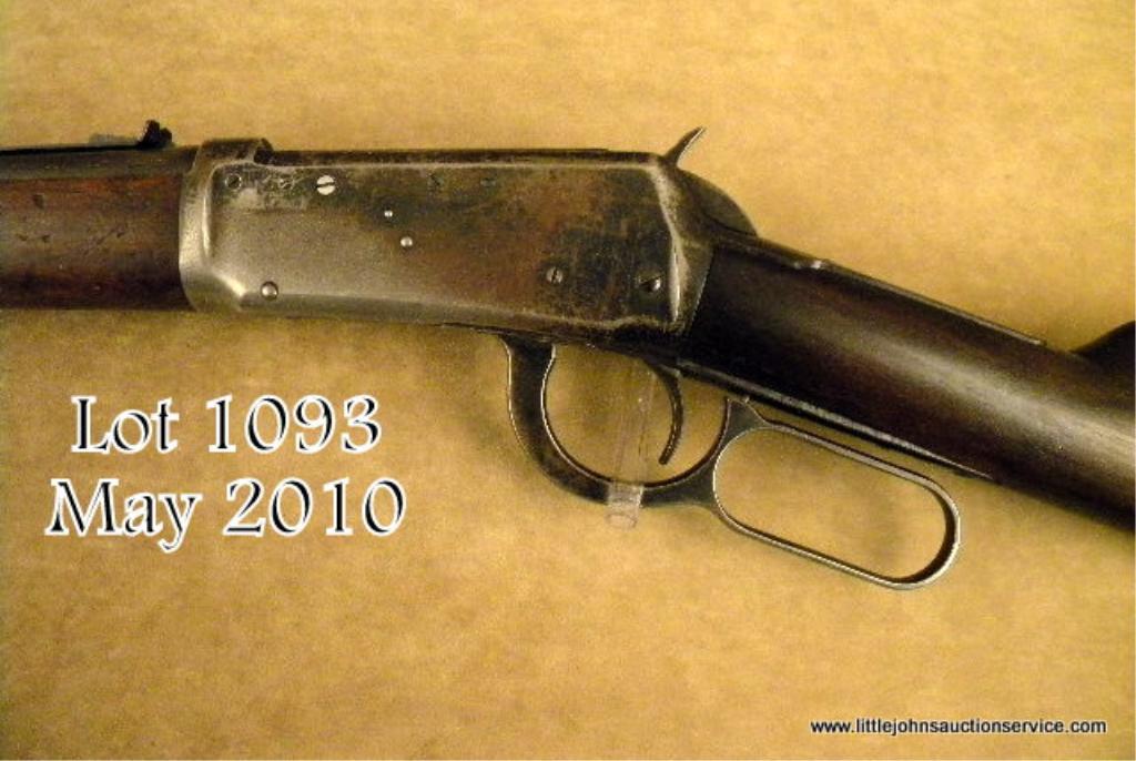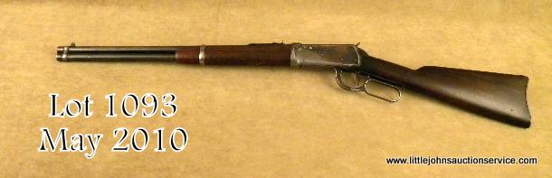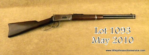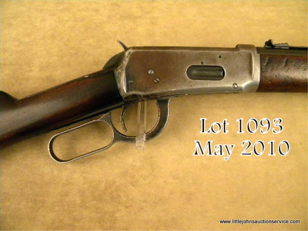 Winchester model 1894 Eastern Carbine with no saddle ring but shows carbine bands and butt. .30-30 caliber, nickel steel barrel, #1064630. The carbine shows 50-70% original blue on barrel and magazine tube evenly drifting on highpoints andedges, some beginning erosion and pinprick pitting. The frame shows 10-20% original blue that is flaking and drifting, some scratches, beginning erosion. The left side of the receiver shows 4 added tap holes with tap screws fromside-mounted sight or scope. The stocks are fair but buttstock shows refinishing. Some dings, mars, scratches in forend. The rear sight is a period replacement in the original dovetail. The markings are good, the action is tight, the bore is verygood. Est: $350 - $700
