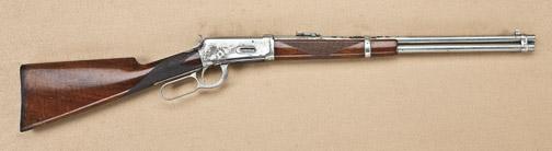 Winchester model 1894 special order SRC, factory full nickel, select checkered walnut stock, hard-rubber buttplate, serial #1051046. The carbine was made without a saddle-ring and shows carbine sights and bands. Approx. 50-70% original nickel remains showing some flaking and erosion where the nickel ahs lifted and some areas of light cleaning. The markings are sharp, the wood is very good with some minor dings, mars, scratches, small chip from toe of buttplate. The action is good, the bore is very good plus to near fine. A scarce full nickel deluxe carbine. Est: $4,000 - $6,000