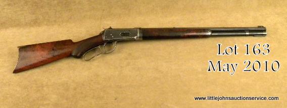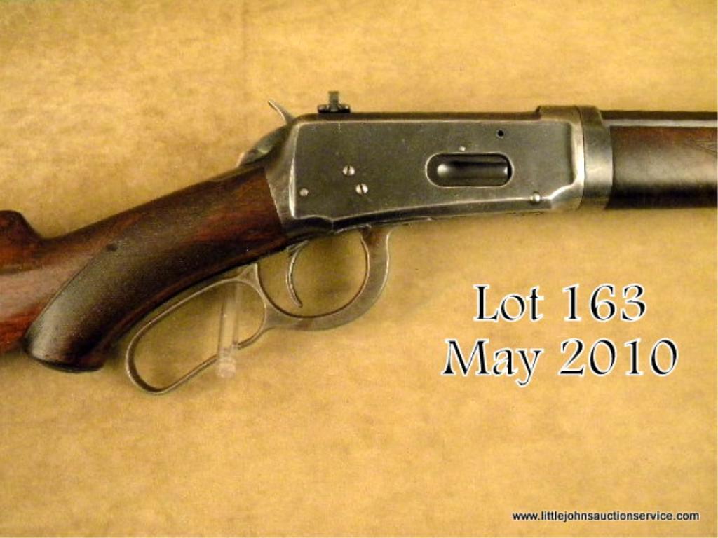: Winchester model 1894 special order rifle, 20" octagon barrel, full magazine, takedown frame, Lyman ladder type receiver sight, checkered deluxe burl walnut stock, crescent butt, .30-30 win caliber, #438804. The barrel and magazine tubeshow 80-90% original blue, thinning on the edges, with some light erosion and pinprick pitting just starting. The frame shows 75-85% original blue drifting at the highpoints and edges. The takedown collar and forend cap show 50-70% thinning blue.There are some operating scratches on the magazine from takedown. The stocks are good plus, with even wear to the checkering, small scratches, some mars, and generally good to very good with a nice burl-wood grain. The markings are sharp, the bor is near excellent. Deluxe short rifles are rare and we have not verified features through factory letter at the time of cataloging. Est: $2,000 - $4,000