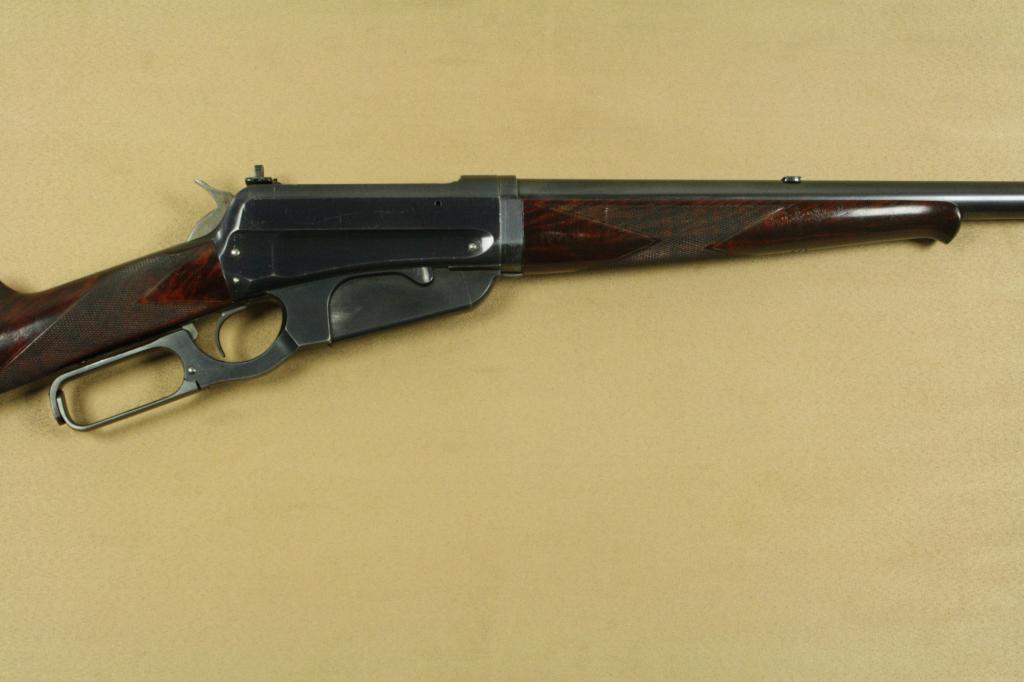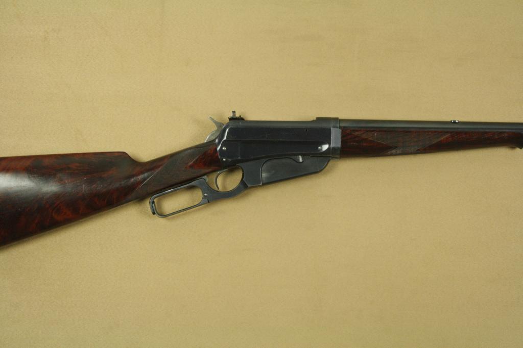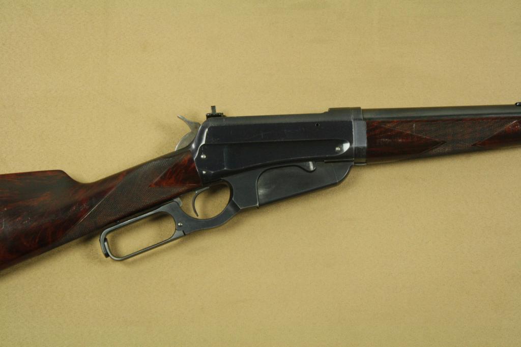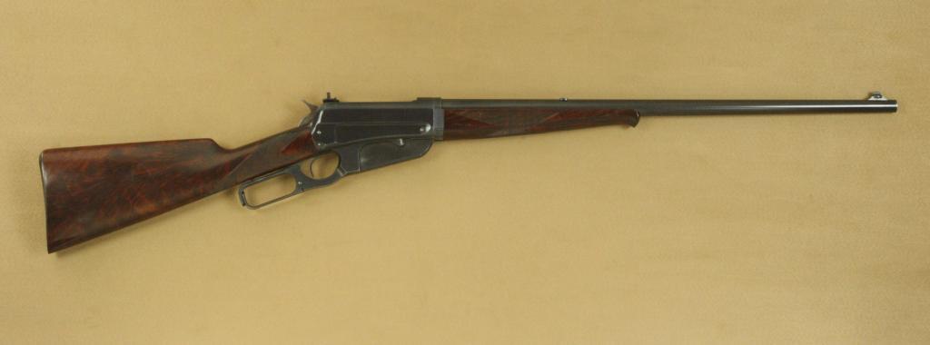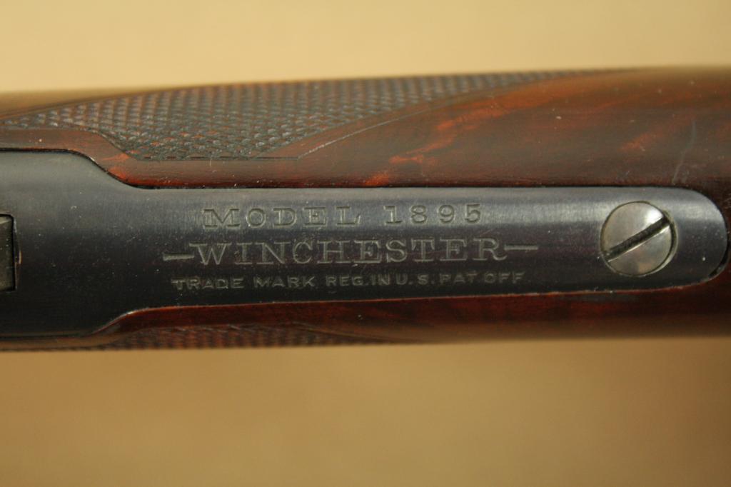 Winchester model 1895, .405 caliber, special order takedown rifle, 24” round barrel, select checkered wood stocks, Lyman receiver sight, serial #64875. The rifle shows 90-95% original blue, just slightly thinning at theedges with some minor scratches, some loss on the operating areas of the action. A few spots on the barrel, but generally crisp and near excellent metal. The stock has been professionally replaced by Roger Kurz ofRoger’s Winchester Restoration Service, and is near perfectly restored and almost undetectable. The rear sight dovetail is filled with a blank and the rifle shows a Lyman sight in the correct dovetail. Themarkings are sharp, action crisp, bore excellent. A great looking 95 in the most desirable caliber. Est: $7,500 - $15,000