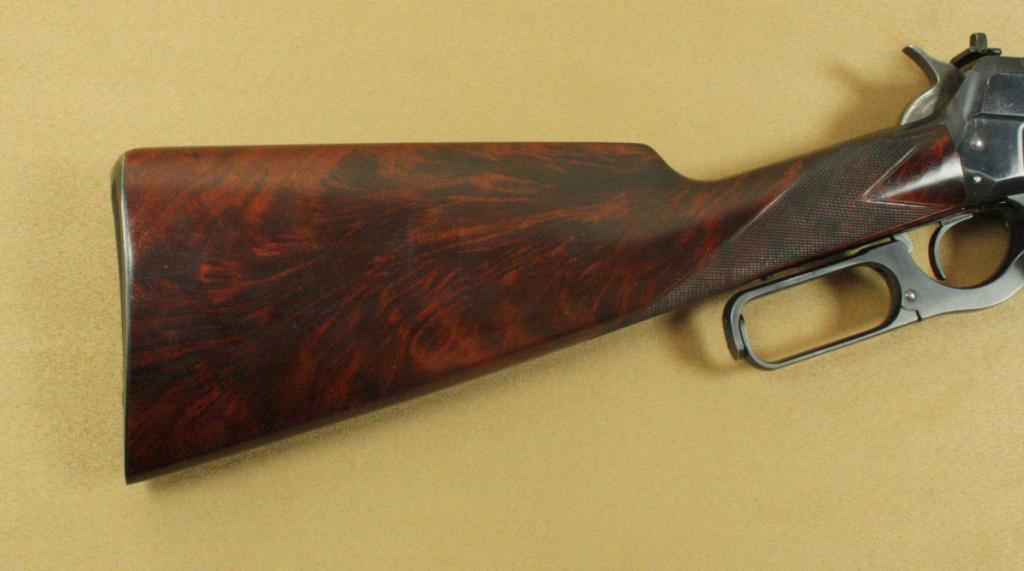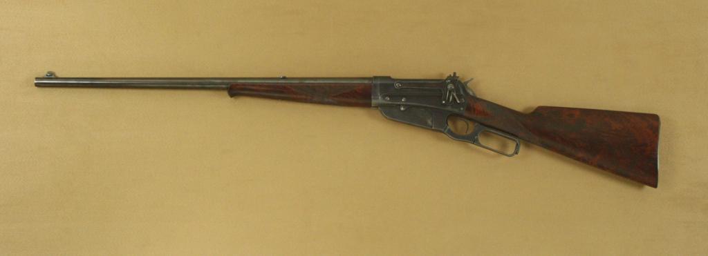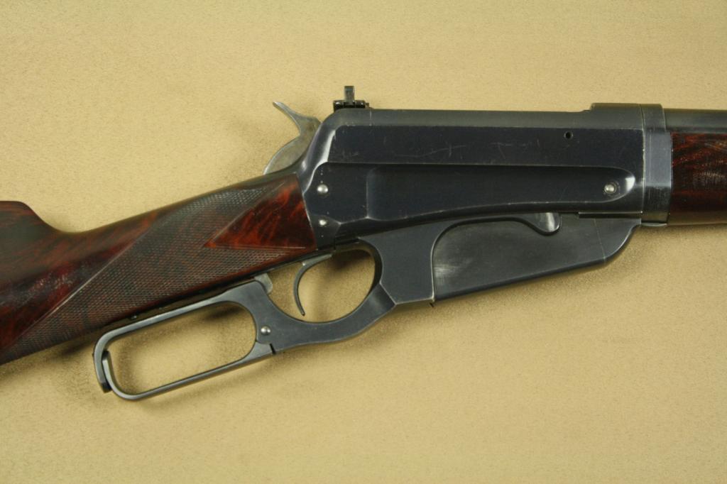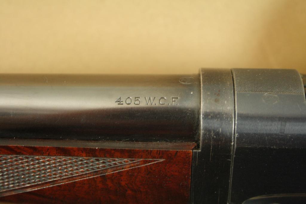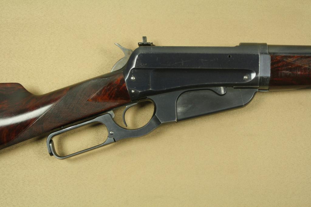 Winchester model 1895, .405 caliber, special order takedown rifle, 24” round barrel, select checkered wood stocks, Lyman receiver sight, serial #64875. The rifle shows 90-95% original blue, just slightly thinning at theedges with some minor scratches, some loss on the operating areas of the action. A few spots on the barrel, but generally crisp and near excellent metal. The stock has been professionally replaced by Roger Kurz ofRoger’s Winchester Restoration Service, and is near perfectly restored and almost undetectable. The rear sight dovetail is filled with a blank and the rifle shows a Lyman sight in the correct dovetail. Themarkings are sharp, action crisp, bore excellent. A great looking 95 in the most desirable caliber. Est: $7,500 - $15,000