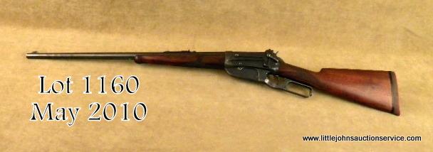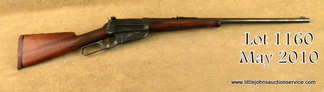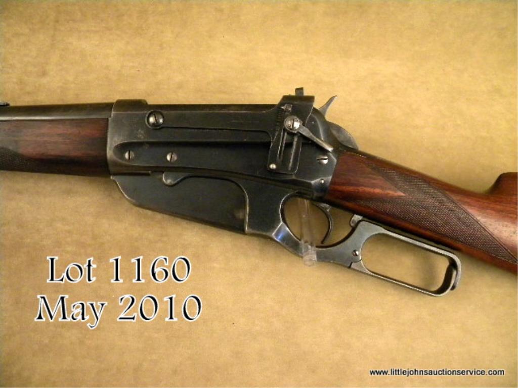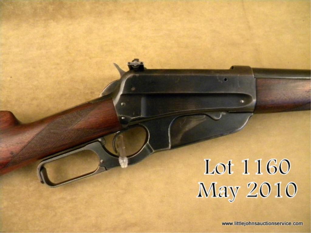 Winchester model 1895 lever action rifle in highly desirable .405 caliber, 24" round barrel, blue finished, Lyman receiver sight, factory checkered plain walnut stocks, Winchester hardrubber recoil pad added, #67990. The rifle remains in very gooplus to near fine condition with 90-95% original blue on barrel, 75-85% blue on receiver, drifting on edges and operating areas. The stock is very good plus with some small losses and slight handling and normal use. The hammer showsconsiderable case hardening. The center portion of the frame shows factory matting. Sharp markings, good action, fine bore. 95 Winchesters are seldom seen and desirable in .405, especially with special-order features. Est: $5,500 - $7,500