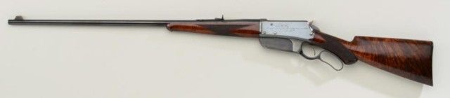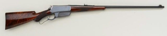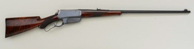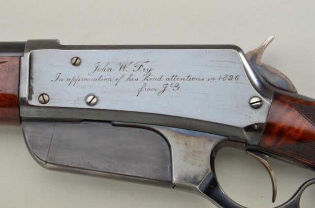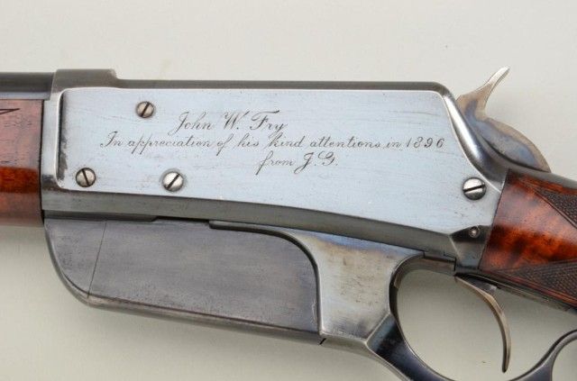 Winchester model 1895 special ordered flat side deluxe with checkered 3x burl walnut stock and pistol grip. Serial #3668. The rifle is inscribed “John W. Fry in appreciation for his kind attentions in 1896from J.G.” on left side of frame. The rifle is chambered in .30 US(.30-.40 Krag) caliber with 28” round barrel. The rifle remains in fine to excellent condition with 95% plus original bright blue thinning at the highpoints and edges of the frame with almost no loss to the barrel which is near excellent. The hammer shows 90%-95% bright original case hardening. The stocks are fine to near excellent with a couple of minor nicks anddents and show a pronounced burl wood grain. The action is crisp the bore is bright. Markings are sharp. Deluxe flat sides are scarce and this example in the top few known. From an old time North West Collector(contact Buffalo Bill Historical Center for factory information). Est.; $25,000-$50,000