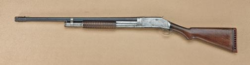 Winchester model 1897 pump-action shotgun, 12ga, serial #698844. The barrel has been reduced to approx. 24” and a poly-choke added, now measuring 26”. The barrel shows 50-60% blue, the action, magazine, and balance of metal have drifted to grey. There is some scattered erosion and pinprick pitting. The stocks are good with some small dings, mars, dents, and minor imperfection. Shows some light cleaning with steel wool, no varnish. An old hard-rubber recoil pad has been added. The stock measures 13-3/8” to the end of the wood. 14-1/2” to the end of the pad. Markings are good. The action is tight. The bores fair to good but may clean as it is very dirty. Est: $200 - $400