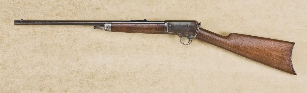 Winchester model 1903, 22 automatic caliber, semi-automatic rifle, serial number “31736”. Rifle is in fair to good condition showing 30-50% original blue, some erosion and scattered surface pitting, some pitting on the left side of the barrel extending 6” back from the muzzle. The left side of the frame shows two tap holes with tap screws inserted. The stocks are good and have been steel wooled, show some dings, mars, normal use. The action good, bore very good. Est.: $150-$300