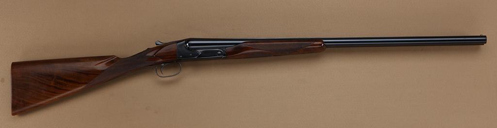 Winchester model 21, 12ga side by side shotgun, factory “Skeet” marked, factory 28” barrels, blue finish, beavertail forend, factory straight stock, checkered butt, single trigger, auto ejectors, serial #25978. The gun is choked “WS1” (right) and “WS2” (left) or approx. “Skeet” and “Improved Cylinder”. The gun remains in original very good plus condition showing 95-98% original blue, some slight losses at high points andedges, some drifting on the triggerguard, toning, sharp markings, and very crisp overall. The stocks are also very good plus with some good grain, sharp checkering, minor use and storage marks, some marks in thevarnish, stocks are at least very good. Stock measures 14-1/4” from the trigger to the end of the factory checkered butt. The gun shows a low-profile raised non-ventilated rib. The action is tight, the bores are very goodplus and look like they would clean to excellent with some dirt from cleaning. A desirable factory Skeet gun. From the Robert Petersen collection. Est: $3,000 - $6,000