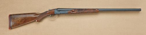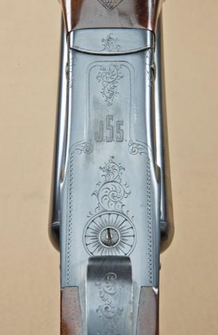 Winchester model 21 12ga side by side shotgun, factory light scroll engraved with monogrammed JSS on bottom of frame. 28” barrels, standard rib, single trigger, auto ejector, select checkered stock, English style leather covered buttplate, serial #3748. The gun shows a factory beavertail forend and remains in very good to near fine condition showing 92-95% original blue, just some thinning at the edges and at the front of the barrel with some very light erosion and pinprick pitting just starting. Choked WS1 and WS1. The stocks are a very good plus to near fine with fancy checkering, some slight hairline cracks in the forend in the frame that are minor and no problem, some even loss of varnish, and just some normal carry and use. The stock measures 13-5/8” to the end of the wood, 14-1/2” to the end of the added old pad. The action is tight, the bores are excellent. From the Robert Petersen Collection. Est: $3,000 - $6,000