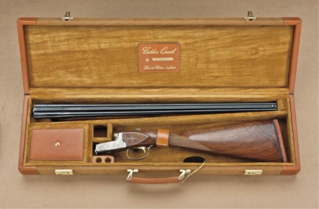 Winchester model 23 Golden Quail side by side, 410 ga, shotgun, single trigger, auto ejectors, choked Improved Modified and Extra Full. 25-1/2” barrels, blue and satin grey finish, English style straight stock, fancy checkered wood, hard-rubber recoil pad with Golden Quail on bottom of frame. Serial #GQ410-44E. The shotgun has seen little to no use. There is some slight erosion from storage on the barrel which mostly has cleaned, just one area of slight roughness and rust toward front left of barrel. At least 97%, and may clean to 99-100%. The gun is contained within its original factory luggage case. Shows slight evidence of firing, minor use. Needs a professional cleaning in one area of the barrel which was mentioned. From the Robert Petersen Estate. Est: $900 - $1,800