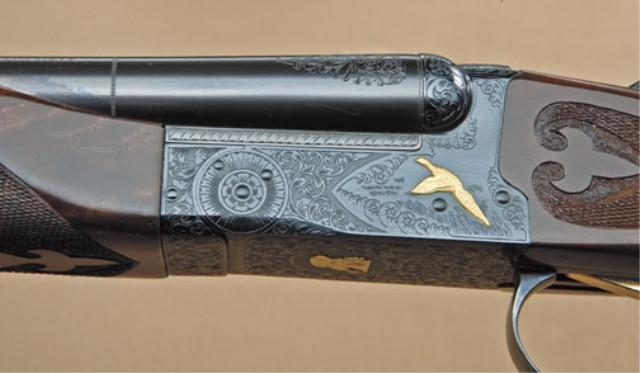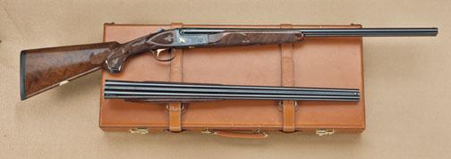 Winchester model 23, custom two-barrel hunting set, .28 ga, finely factory engraved and gold inlaid, fancy checkered wood stock with fleur de lis pattern and hardrubber buttplate. First barrel set measures full choked Mod. Second barrels are 25-1/2” barrel choked “Mod” and “Improved Cyl”. Single trigger. Auto Ejector. Fine to excellent original condition showing just slight use and minor firing. 98-99%, one or two small marks in stock. With case and extra barrel. serial #WBS483E Est: $3,500 - $5,000