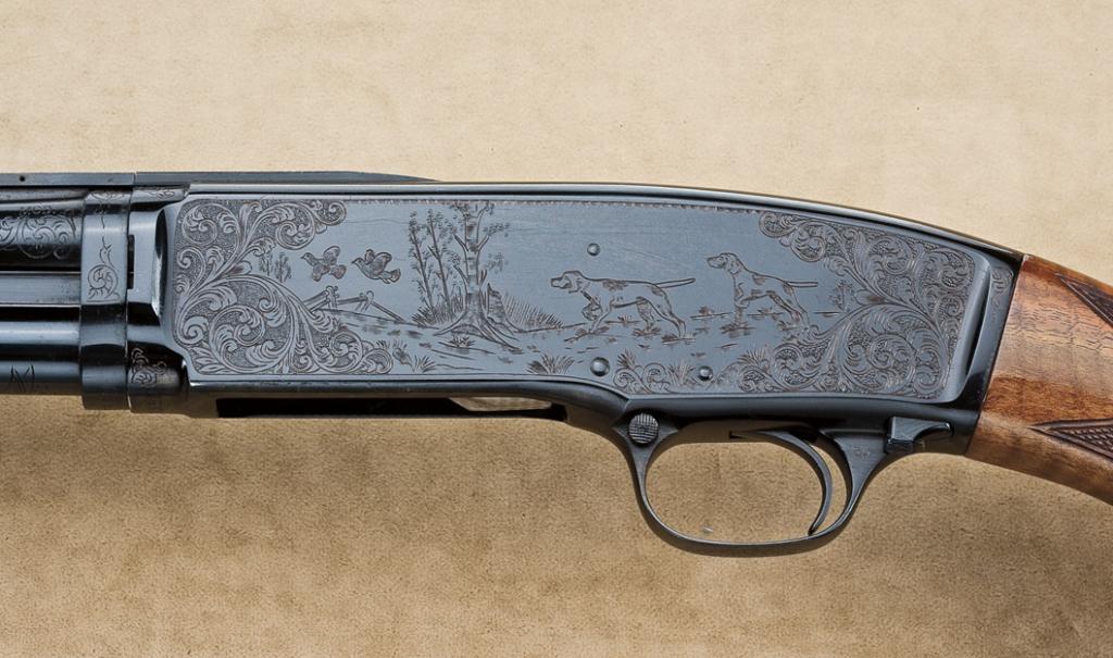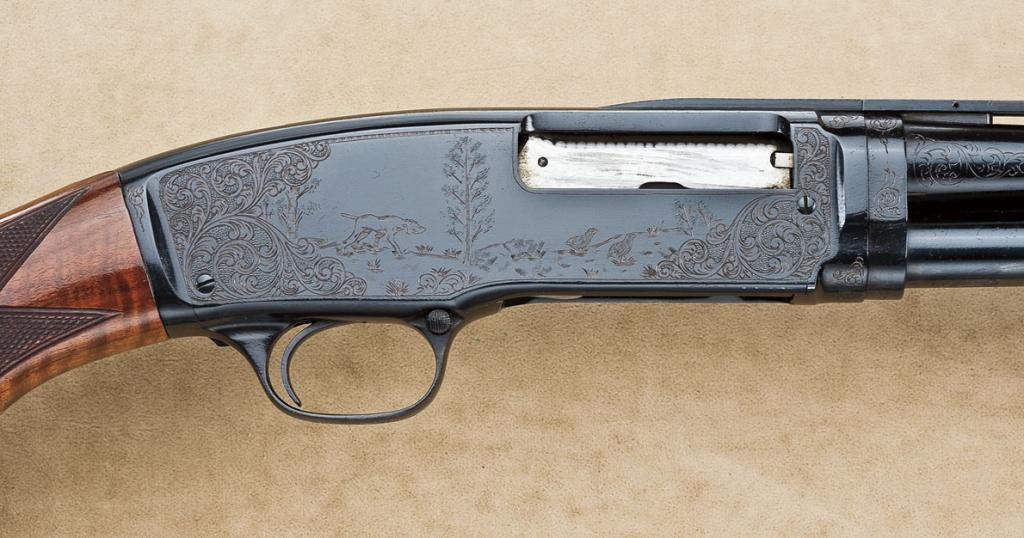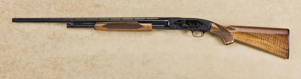 Winchester model 42, .410ga, pump action shotgun, 26” barrel, Simmons type ventilated rib, custom upgraded to pigeon grade, fancy engraved action, select checkered wood custom stocks, serial number “127369”. The gun shows approx. 98-99% plus upgraded royal blue finish, just some minor operation and use since restoration. The stocks show a beautiful light color with fiddleback striping and are nicely checkered and remain in fine condition. The action shows engine turning and honing, the bore is near excellent, and the barrel is marked “modified choke”. The buttstock measures nearly 14-1/2” to the end of the wood, and shows a Winchester hard rubber buttplate. The engraving is good quality and similar to factory style and there is a factory style pigeon engraved in the rear of the magazine. The left rear of the trigger guard is stamped “E. O.” A very pretty .410 with high grade custom work. Est.: $2,500-$5,000