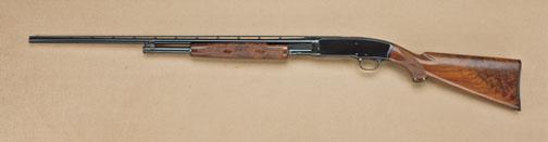 Winchester model 42 410ga pump-action shotgun, factory Skeet marked with factory ventilated rib. 28” barrel, select walnut stock with diamond checkered panels, serial #134988. Shows Winchester pistol grip cap and Winchester hard-rubber buttplate. The gun remains in fine to near excellent original condition, with 92-96% original blue, some losses at the edges and operating areas. The stocks are near excellent with just a couple of slight handling marks and normal age. The action is good, the bore is excellent. There is a 1X marking on the rear of the triggerguard bow on the left side which appears to be a factory stamp. From the Robert Petersen Collection. Est: $2,000 - $4,000