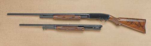 Winchester model 42, .410ga, pump action shotgun, two barrel set, serial #76694. Frame stamped Deluxe, upgrade and refinished to excellent condition. The gun shows a 28” barrel, with raised milled factory rib, marked “Full Choke” with deluxe checkered select burl walnut stocks, engine turned bolt and follower, showing 99% of an excellent quality refinish and restocking. The extra barrel measures 27-1/2”, showing factory raised milled rib marked “skeet”, serial numbered 76694. This barrel shows approx. 95% original finish, some wear at the edges, and matching pattern to replaced forend. The interior shows slight use on both barrels and an excellent quality upgrade and refinish. We cannot guarantee the Deluxe marking on the frame as it may have been added at time of restoration. However, an attractive two-barrel set. From the Robert Petersen estate. Est: $2,000 - $4,000