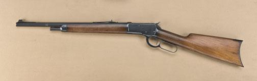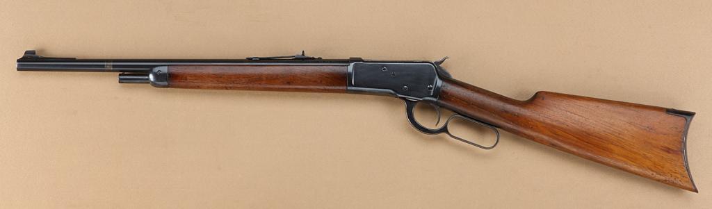 Winchester model 43 lever-action rifle in .218 Bee caliber, serial #384580. Barrel shortened to 18”, magazine reduced to 1/2 mag. Reblued finish, with Marbles rear sight and non-factory front sight and base added.The metal surfaces are good as refinished, showing some scratches and markings on the barrel. The stocks are fair to good with some slightly rough areas around the wrist and small losses around the buttplate. The action is good, the bore is excellent. Very serviceable rifle that was used as a ranch gun in central California. Est: $500 - $1,000