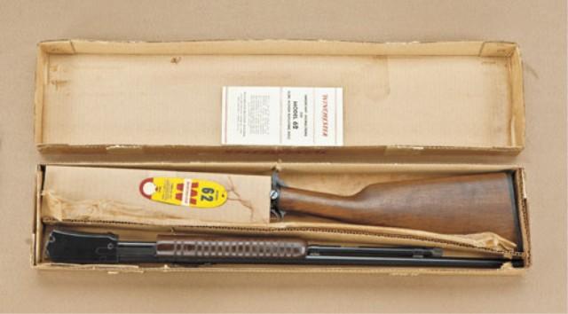 Winchester model 62, pump action rifle, .22 caliber short, long, and long rifle. Like new in box with hanging tag. Factory information manual and advertisers. Shows no evidence of firing or use, 99% to new. Serial #410413. Box shows just some normal storage and aging, small imperfections, and serial numbered to match. From the estate of Robert Petersen. Est: $900 - $1,800