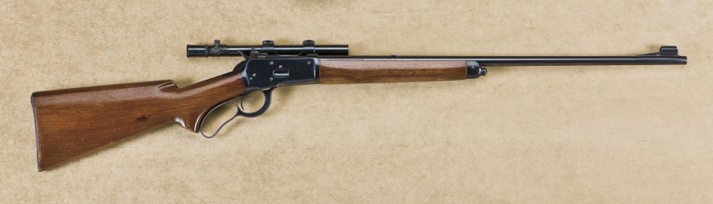 Winchester model 65 lever-action rifle, .218 bee caliber, with early bolt peep sight, mounted with model 29S Weaver scope on T6 side mount. Serial #1006028. The rifle remains in near fine original condition showing 95-98% original blue, just toning slightly with some thinning at the edges and bottom side of frame and muzzle. The stock is very good plus to near fine with some minor storage scratches, marks, slight handling and minor use. The buttplate shows some rust and erosion, but is the original milled steel and possibly can be cleaned. The scope and mount show 95-98% blue. The dovetail in barrel is plugged and it is possible that the scope was factory supplied. The action is crisp, the bore very good, and may clean as it is dirty. Est: $1,400 - $2,800