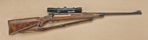 Winchester model 70 .270 caliber pre-64 bolt-action rifle, serial #164407. Floorplate engraved “Custom Winchester Built” with flaming Winchester trademark. The rifle shows a finely carved select burl walnut stock with Winchester grip cap, milled steel buttplate, and super grade type forend cap. The rifle shows 98% factory finish, some handling and use, and is mounted with a Lyman all-weather 4x scope on Buehler mounts. The bore is fine to excellent, custom made by Winchester for Mr. Robert Petersen. From the Robert Petersen Collection. Est: $1,500 - $3,000