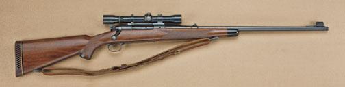 Winchester model 70, .30-06 caliber pre-64 Supergrade rifle, serial #42659. The rifle is mounted with a Weaver K4 scope on Redfield mounts screwed into factory tap holes. The rear sight has been replaced with a folding non-Winchester rear sight in the original barrel dovetail. The stock shows quick detachable sling swivels and leather sling attached. The metal surfaces show 90-95% original blue. The stocks are good to very good with a white-line recoil pad added. The stock measures 12-3/4” to the end of the wood, 14” to the end of the recoil pad. The rifle is in very good condition just showing some normal use and carry during hunting. Action good, bore very good. =From the Robert Petersen Collection. Est: $1,100 -2200